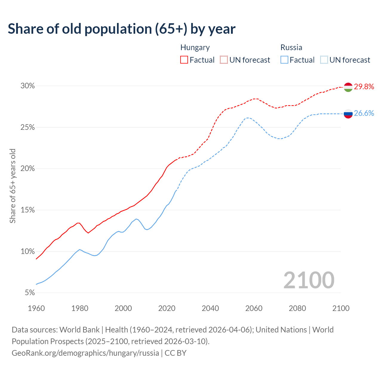 The share of older people aged 65 and over is 21% in Hungary and 17.2% in Russia. Life expectancy in Hungary compared to Russia .