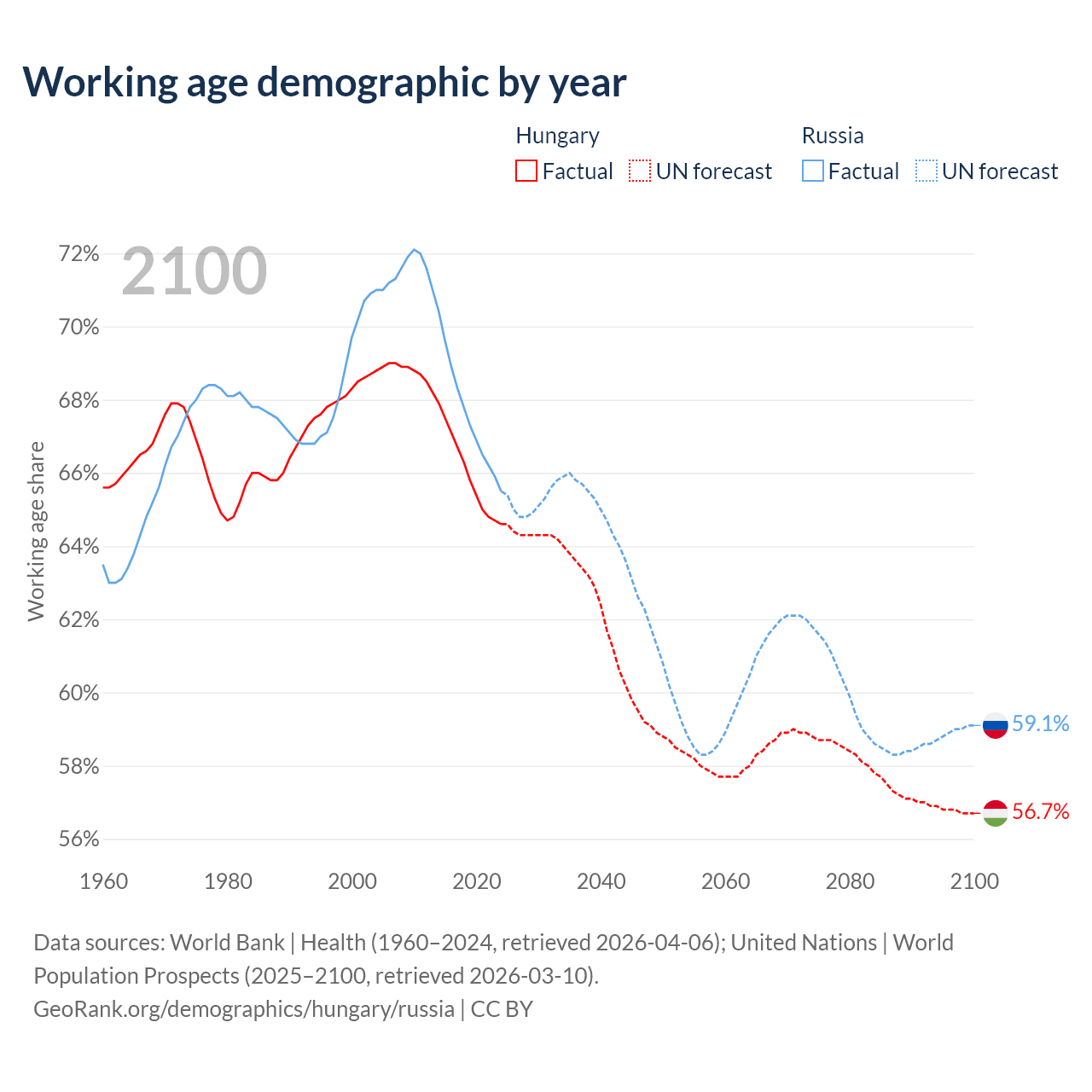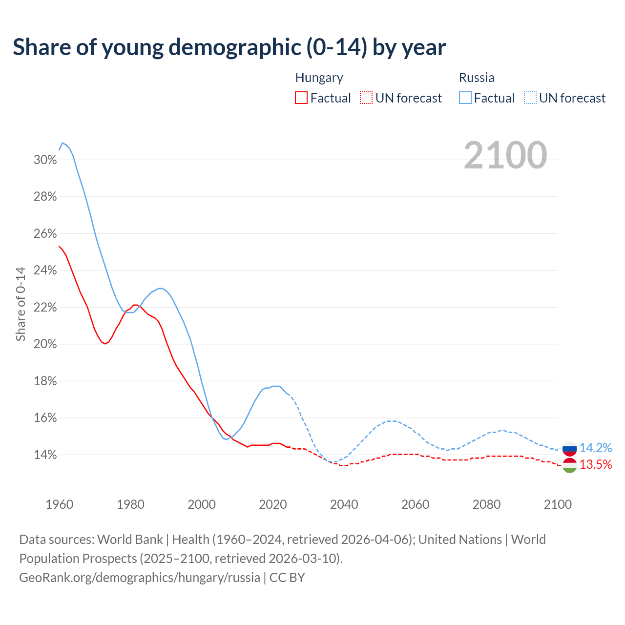 Median age Hungary vs Russia, 1960-2100
