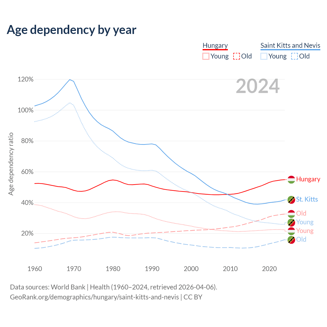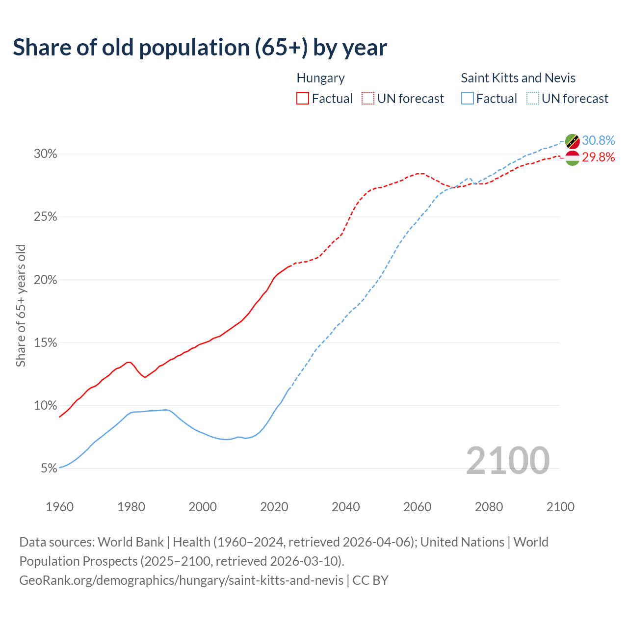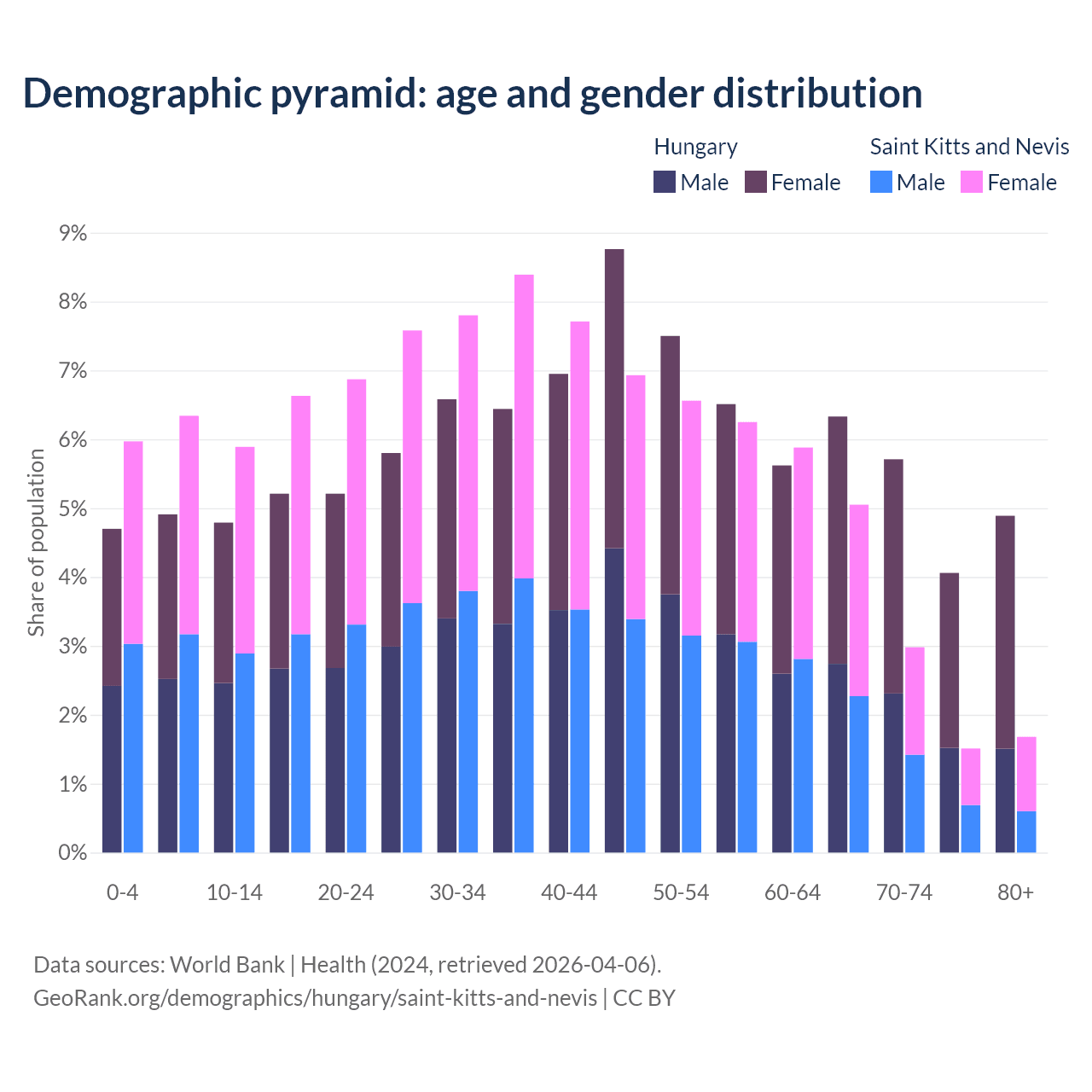 The share of older people aged 65 and over is 21% in Hungary and 11.2% in Saint Kitts and Nevis. Life expectancy in Hungary compared to Saint Kitts and Nevis .