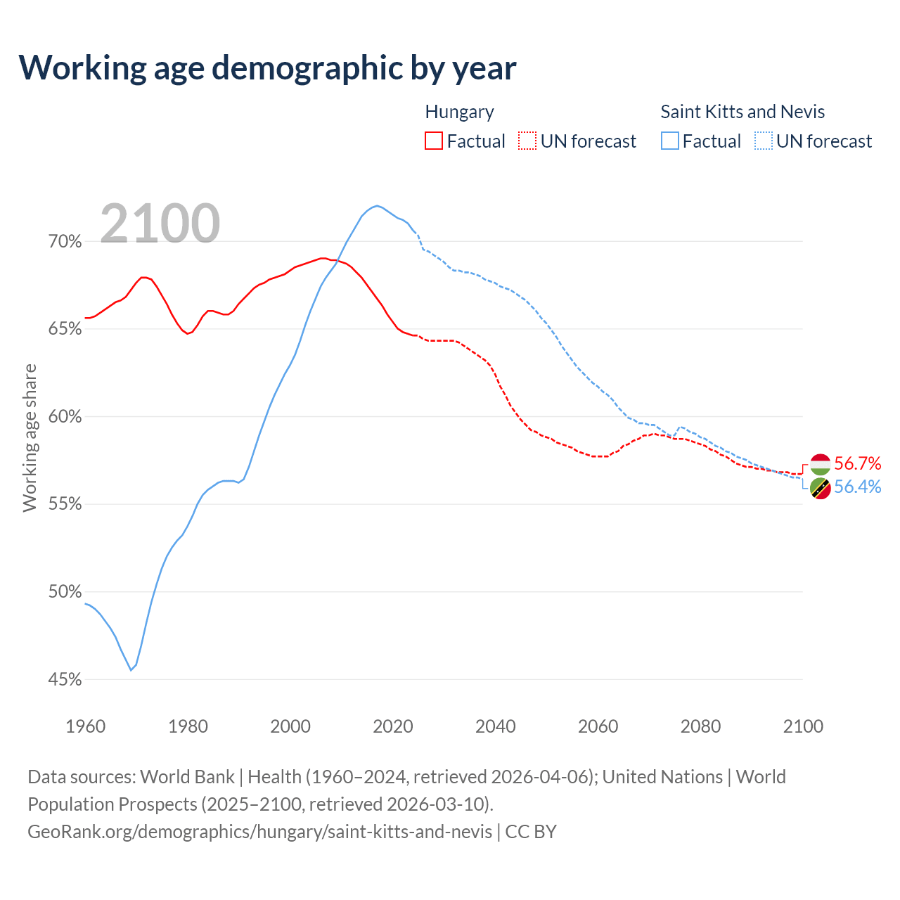 - Hungary has 6.12M working age adults (aged 15-64) vs 33.2K in Saint Kitts and Nevis.