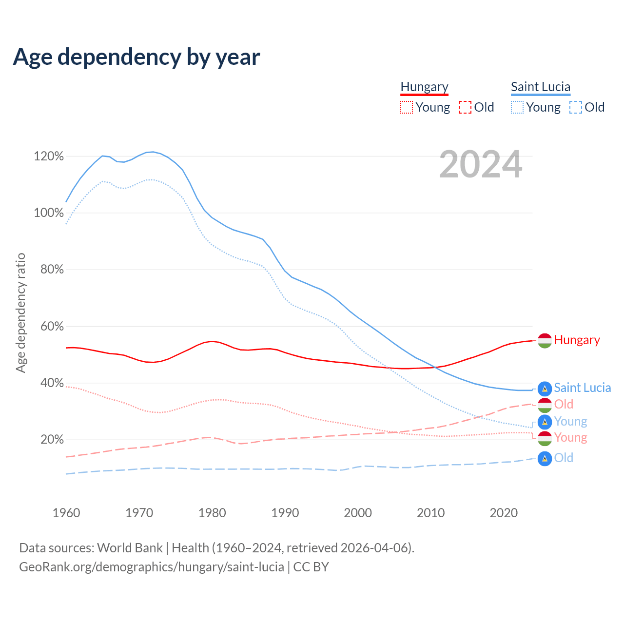 - The share of old-age demographic (65+) in Hungary is 21% vs 9.62% in Saint Lucia.