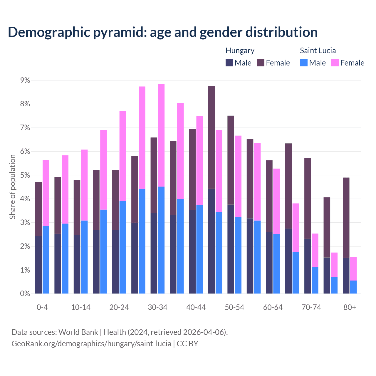 The share of older people aged 65 and over is 21% in Hungary and 9.62% in Saint Lucia. Life expectancy in Hungary compared to Saint Lucia .
