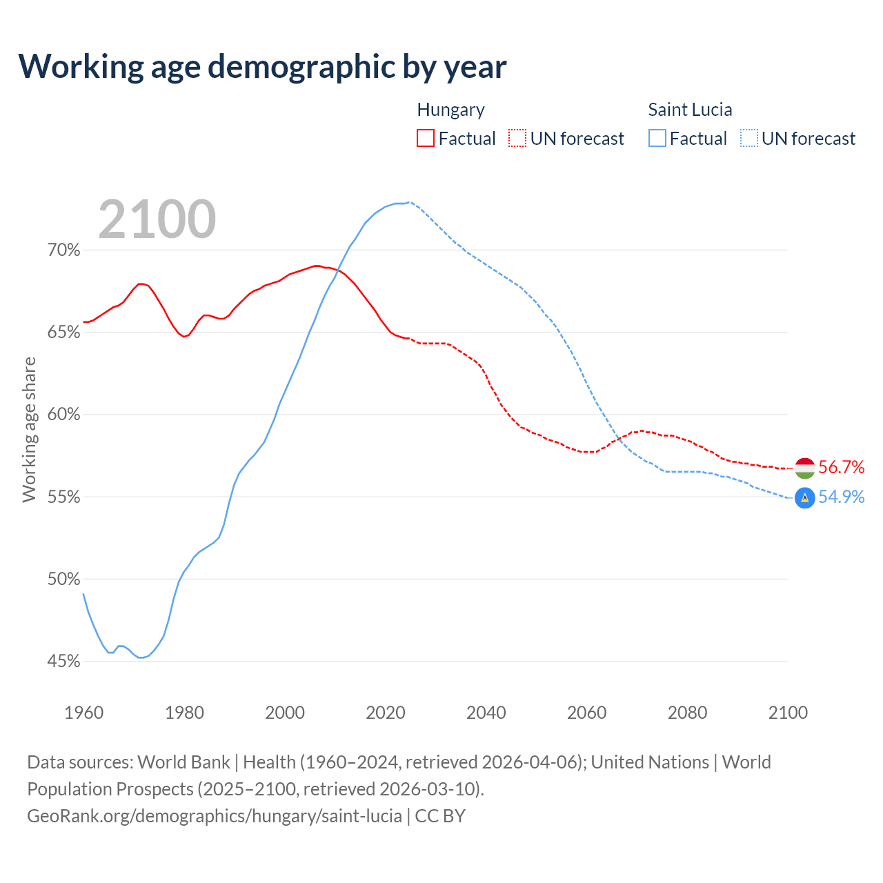 - Hungary has 6.12M working age adults (aged 15-64) vs 132K in Saint Lucia.
