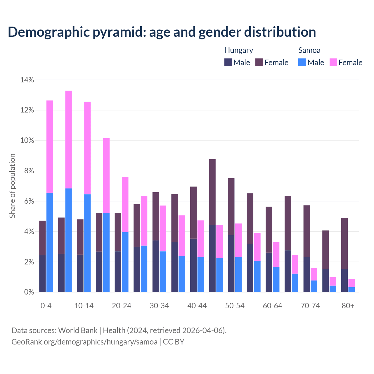 - Hungary is ranked 17/196 by median age (oldest to youngest) vs 158/196 for Samoa.