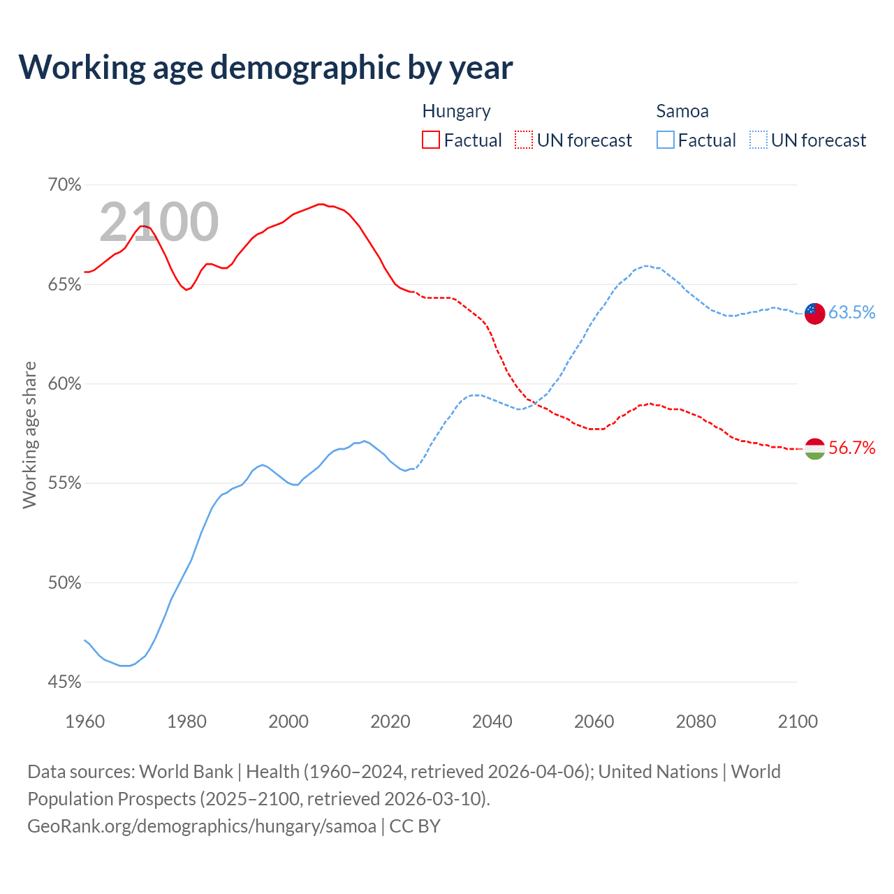 - Hungary has 6.12M working age adults (aged 15-64) vs 123K in Samoa.