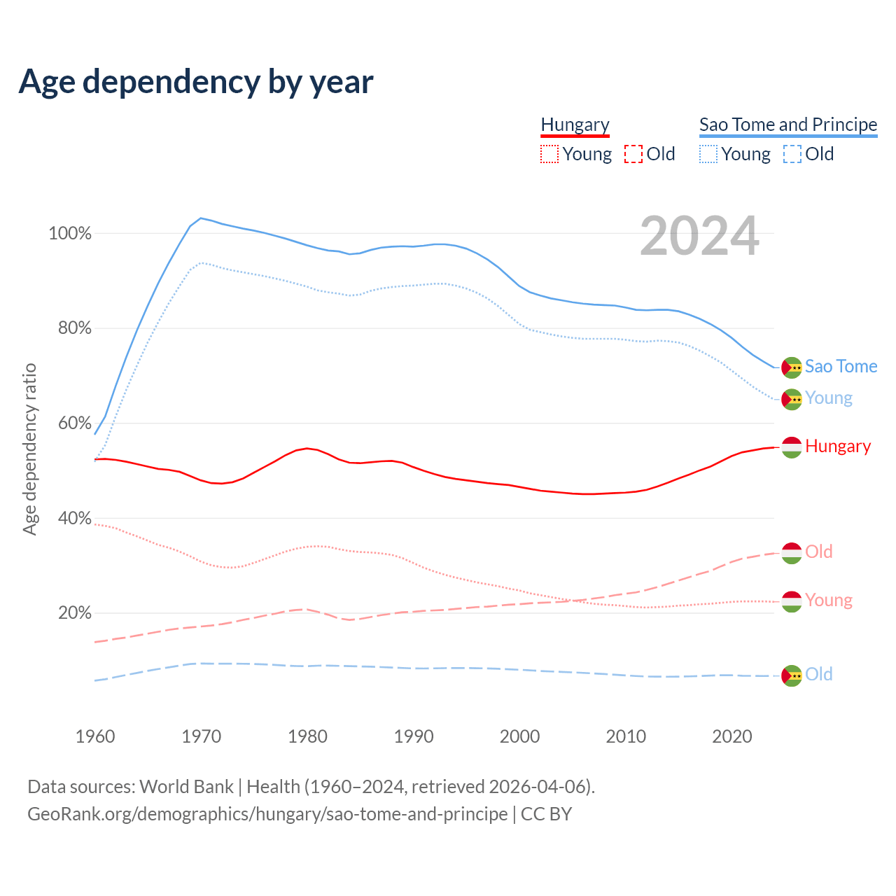 - Hungary is ranked 17/196 by median age (oldest to youngest) vs 163/196 for Sao Tome and Principe.