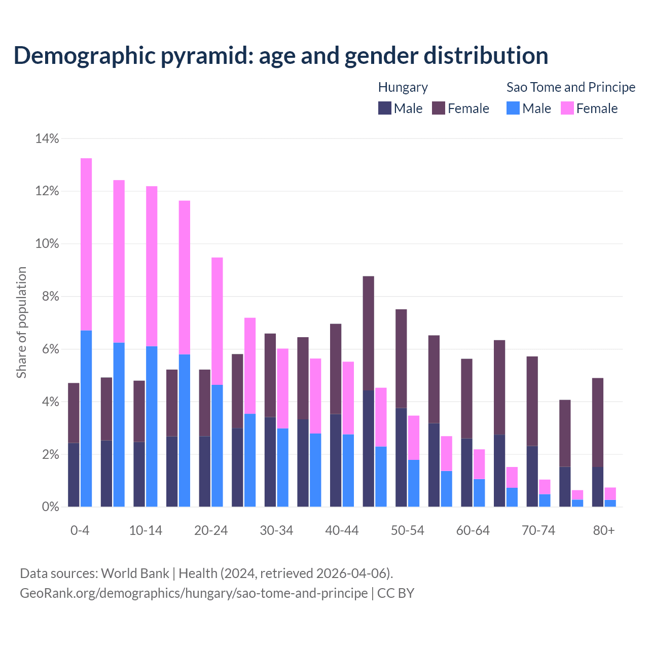 - The share of young demographic (0-15 years old) in Hungary is 14.4% vs 37.8% in Sao Tome and Principe.