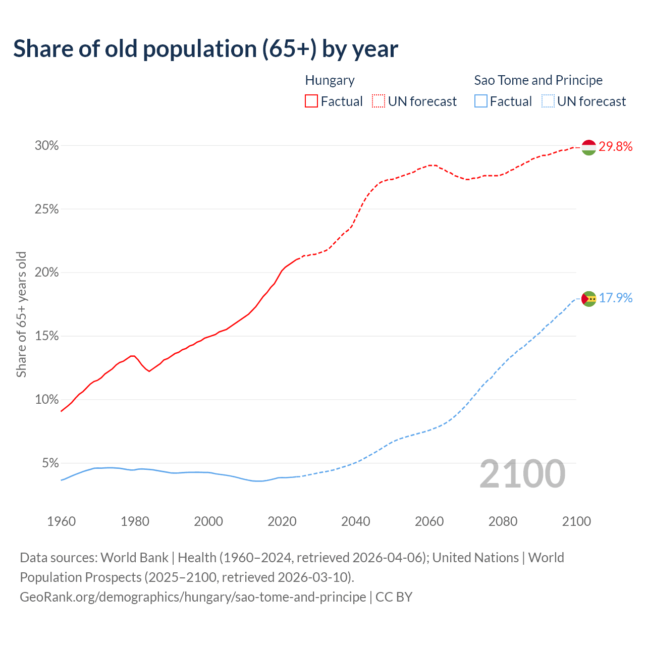 The share of older people aged 65 and over is 21% in Hungary and 3.9% in Sao Tome and Principe. Life expectancy in Hungary compared to Sao Tome and Principe .