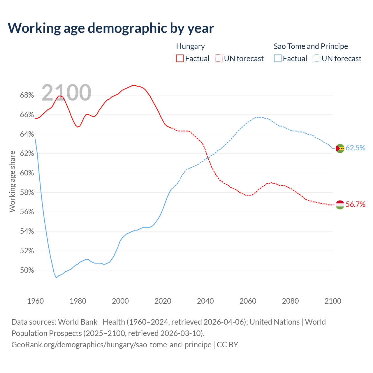 Median age Hungary vs Sao Tome and Principe, 1960-2100