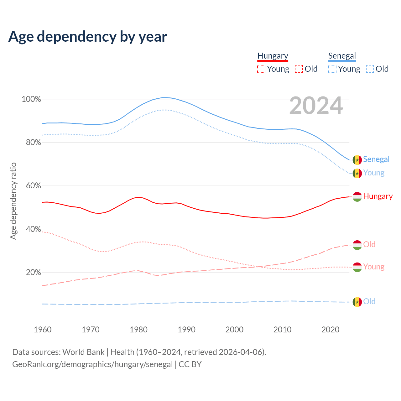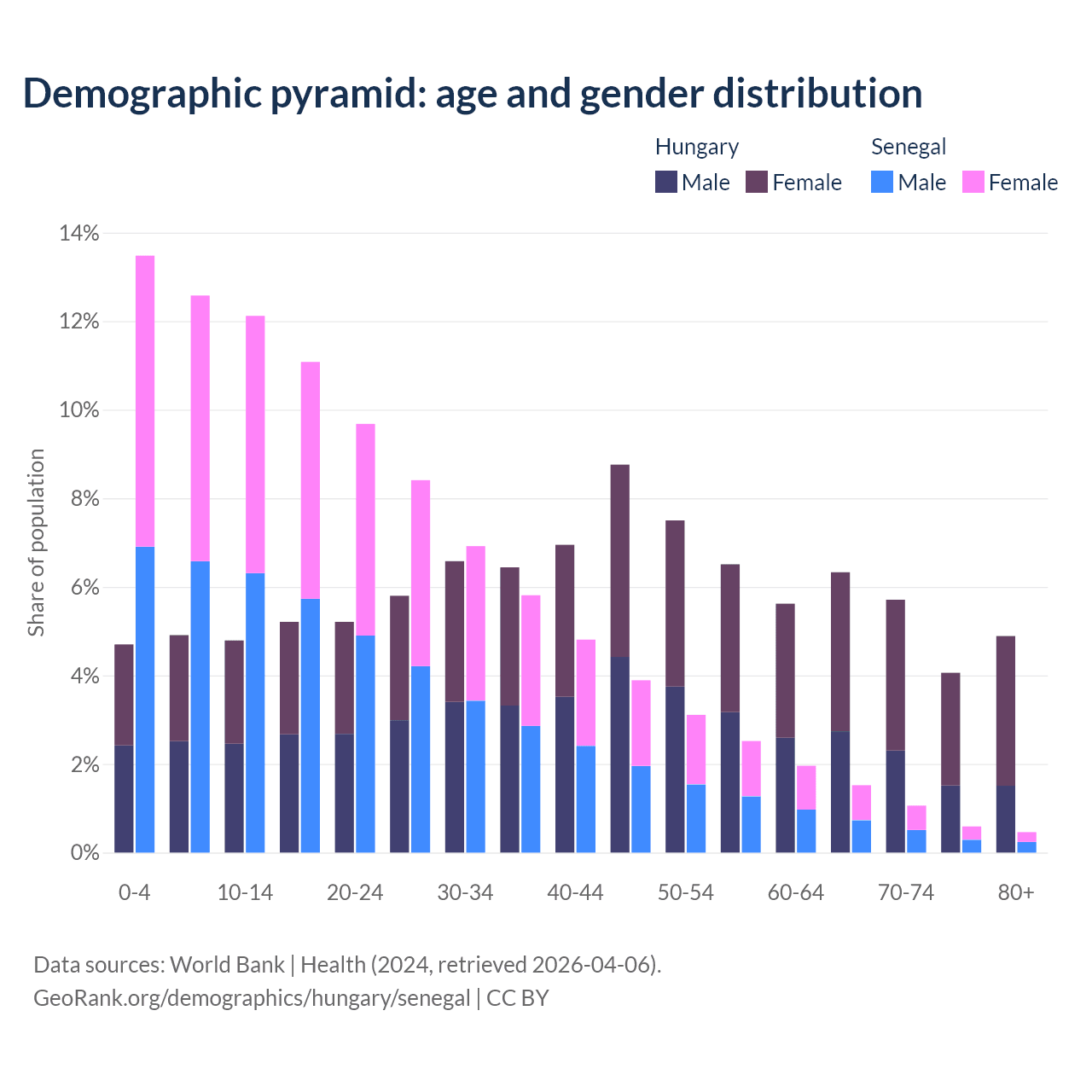 - Hungary is ranked 17/196 by median age (oldest to youngest) vs 162/196 for Senegal.