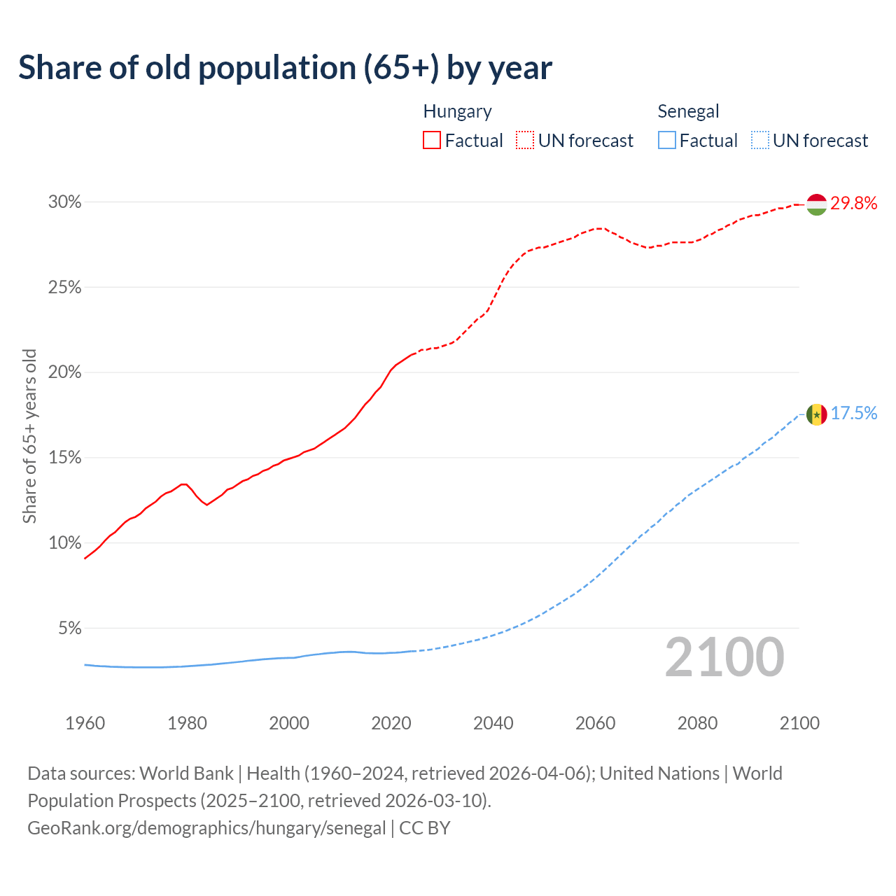 The share of older people aged 65 and over is 21% in Hungary and 3.62% in Senegal. Life expectancy in Hungary compared to Senegal .