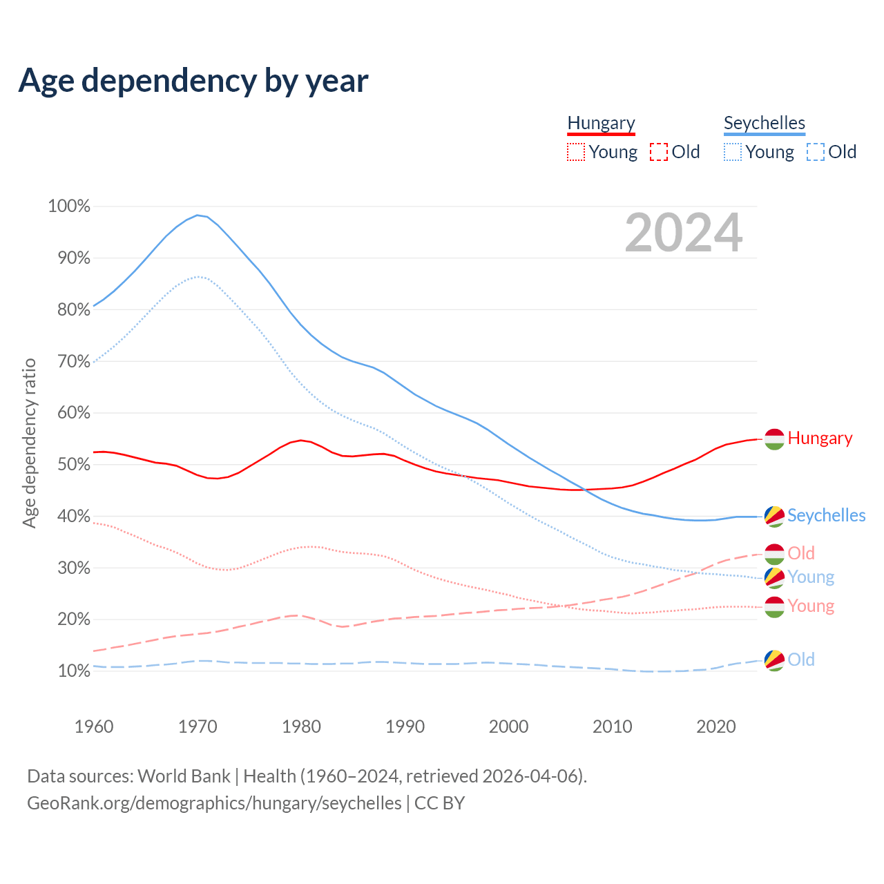 - Hungary is ranked 17/196 by median age (oldest to youngest) vs 76/196 for the Seychelles.