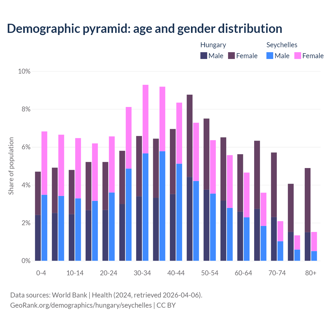- As of 2026, the population of Hungary is 9.48M vs 126K in the Seychelles - 75 times difference.