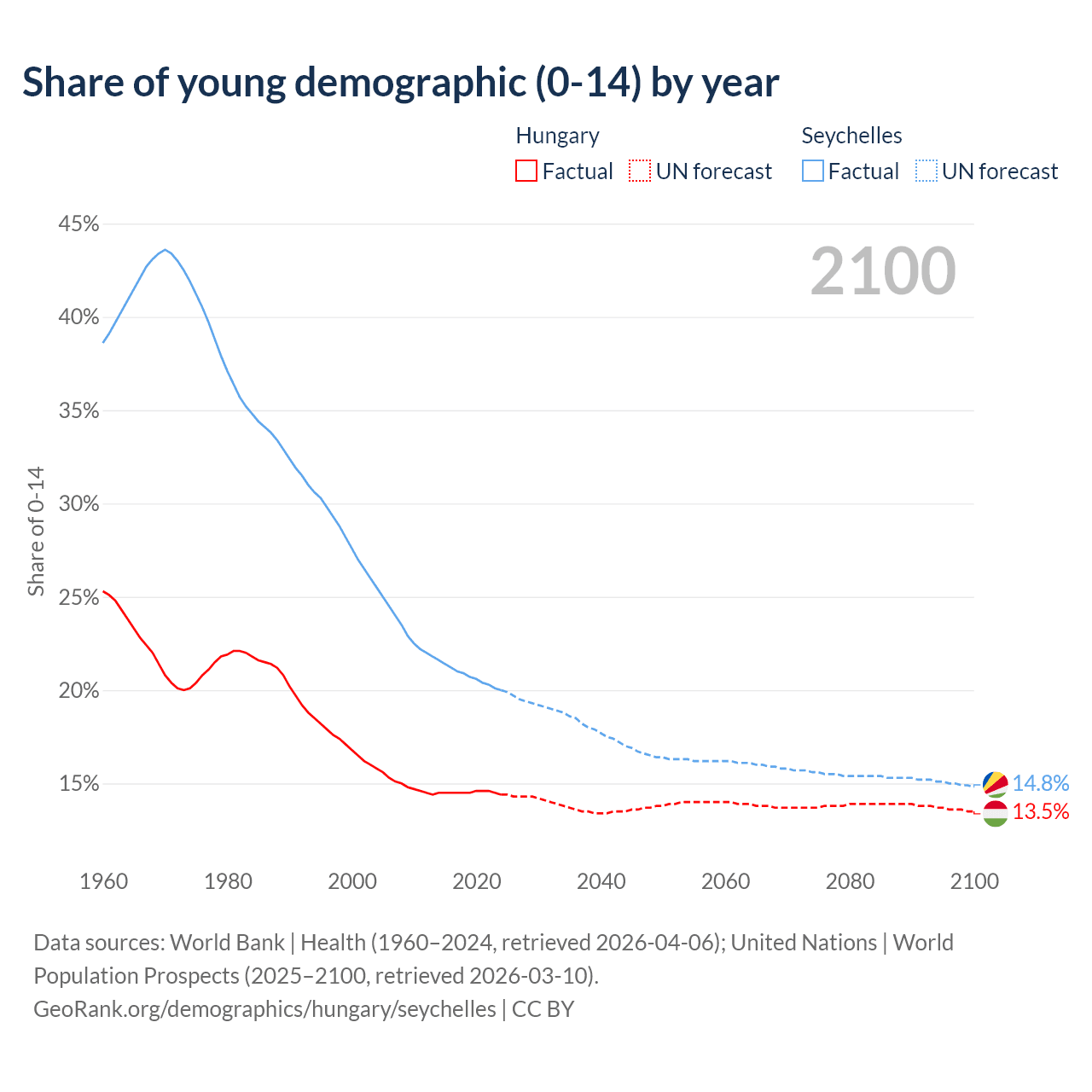 - The share of young demographic (0-15 years old) in Hungary is 14.4% vs 20% in the Seychelles.