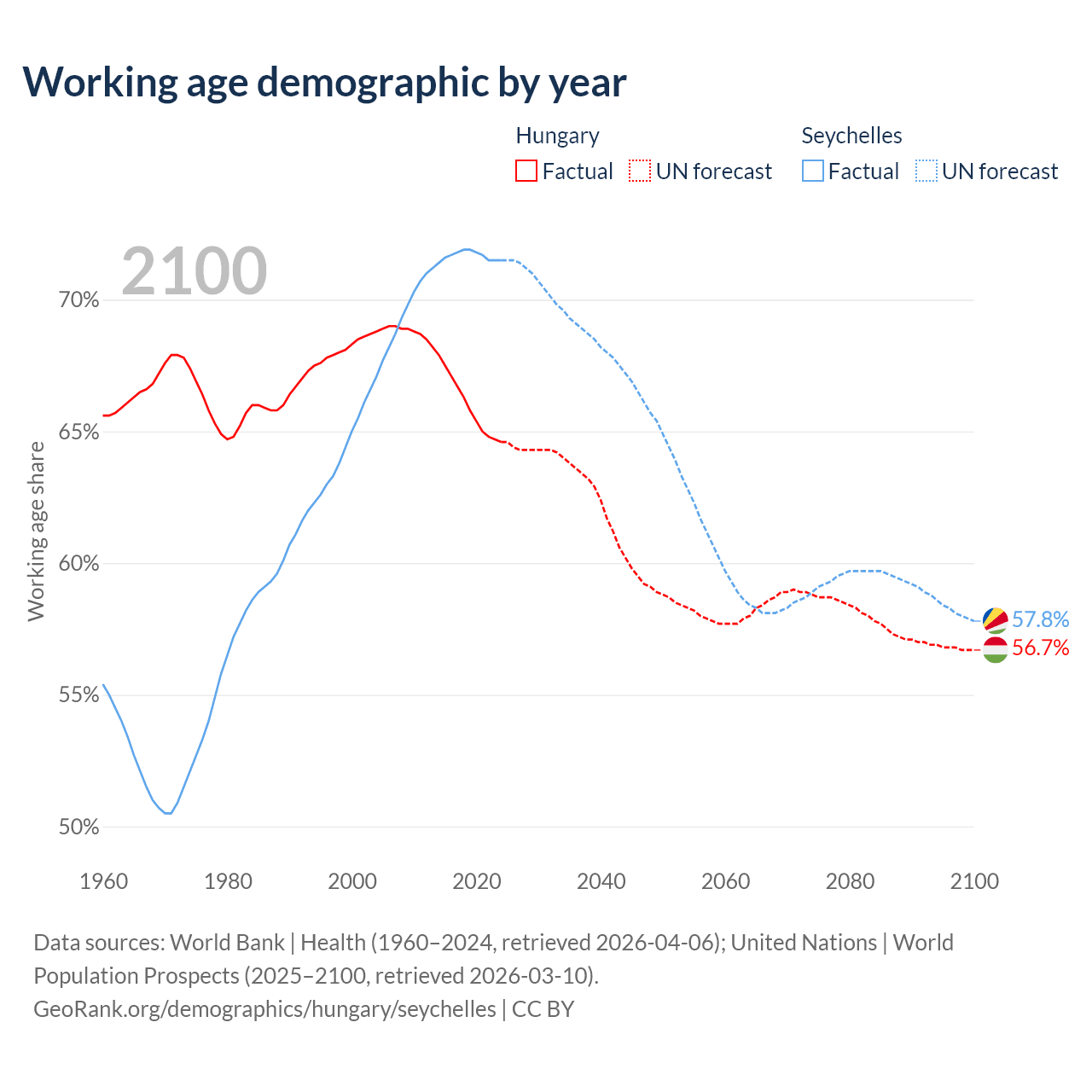 - Hungary has 6.12M working age adults (aged 15-64) vs 90.3K in the Seychelles.