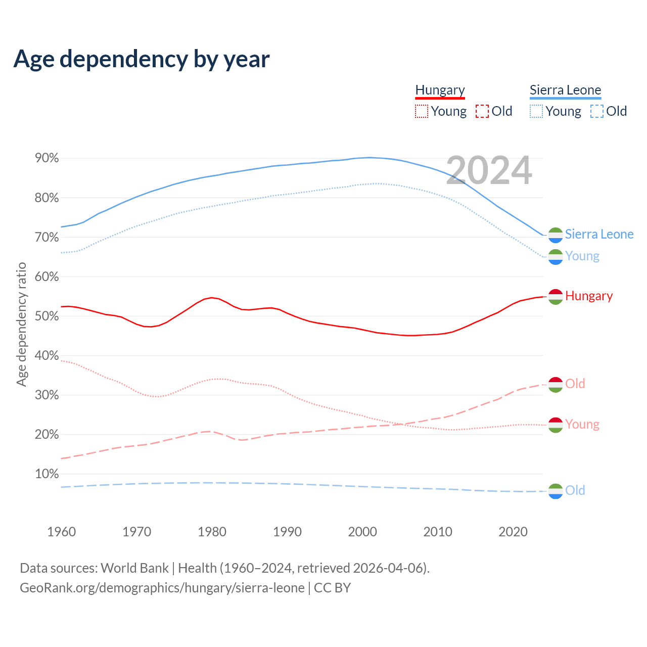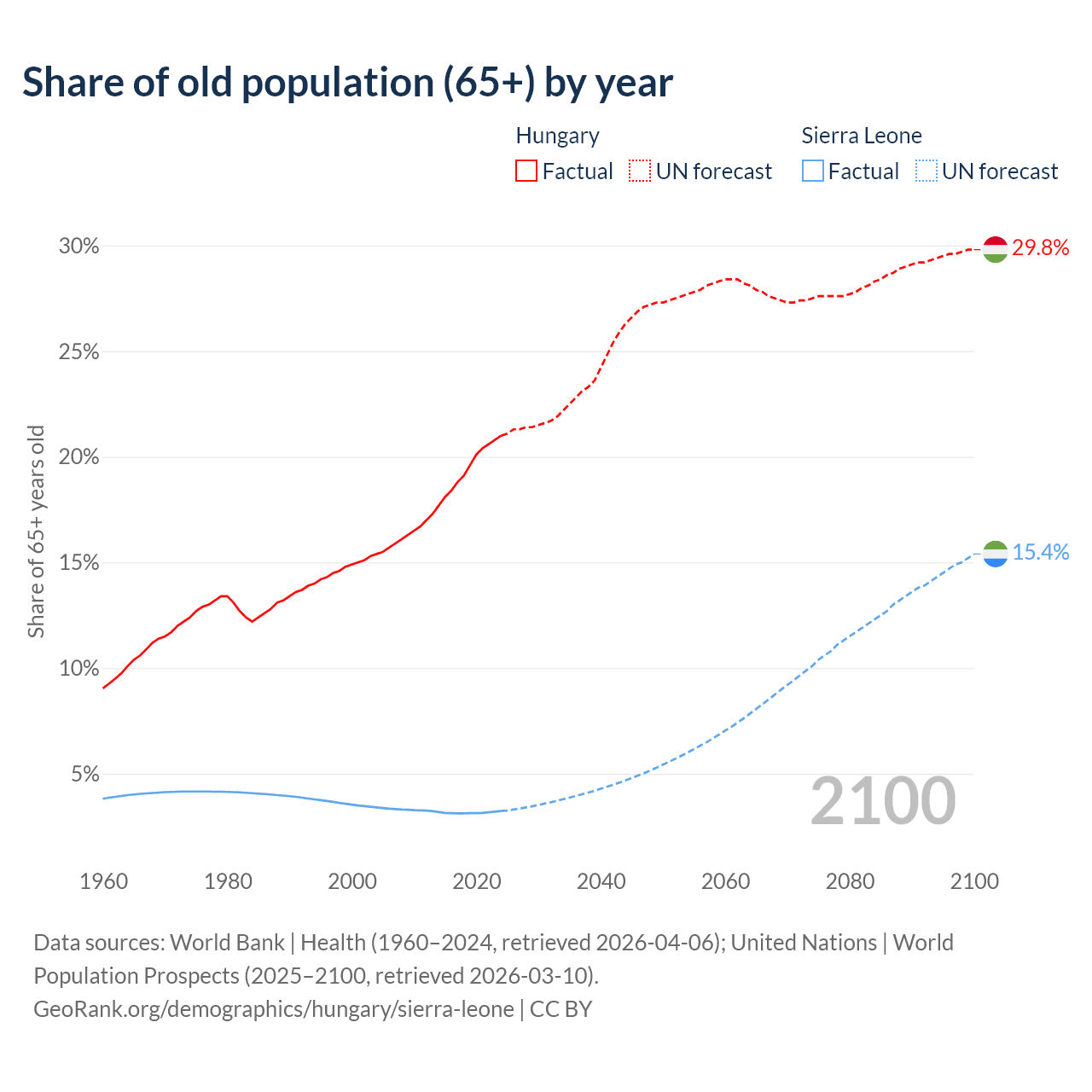The share of older people aged 65 and over is 21% in Hungary and 3.24% in Sierra Leone. Life expectancy in Hungary compared to Sierra Leone .