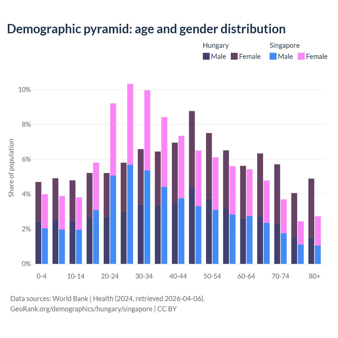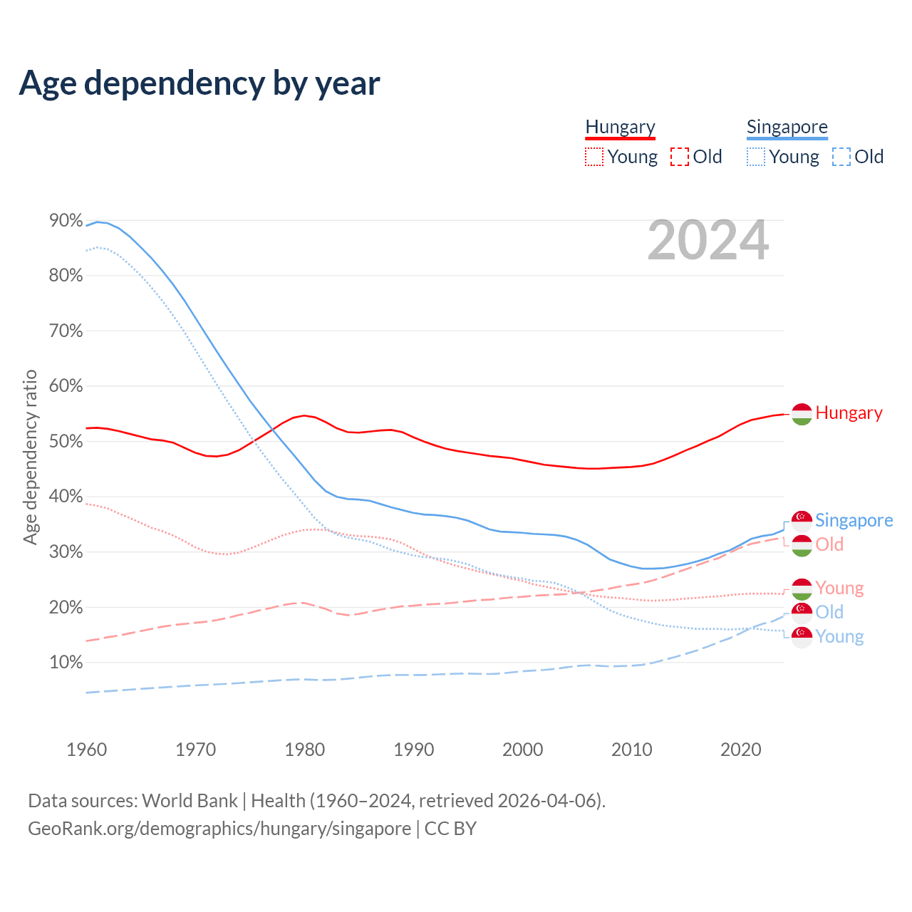 - Hungary is ranked 17/196 by median age (oldest to youngest) vs 68/196 for Singapore.