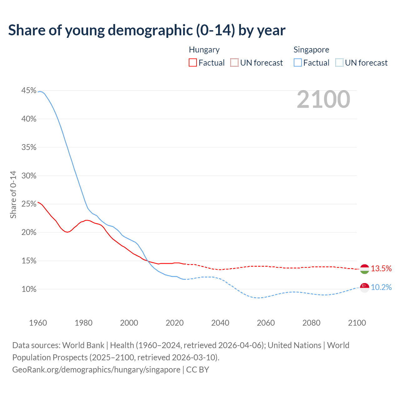 - The share of young demographic (0-15 years old) in Hungary is 14.4% vs 11.7% in Singapore.