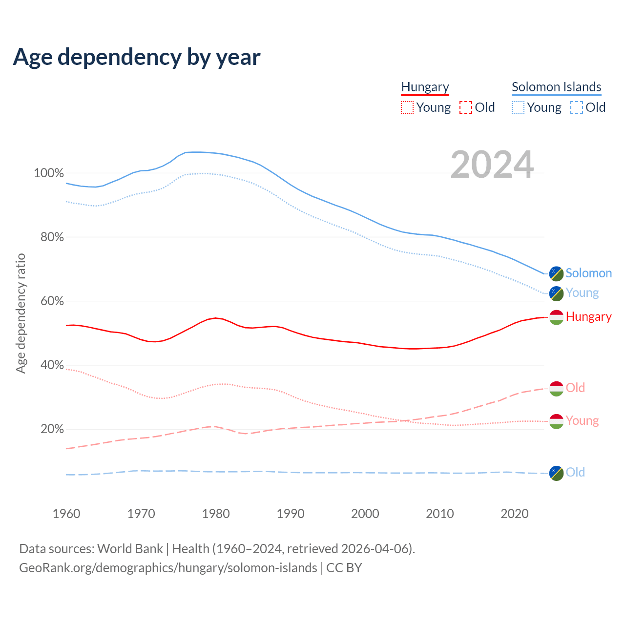 - Hungary is ranked 17/196 by median age (oldest to youngest) vs 153/196 for the Solomon Islands.