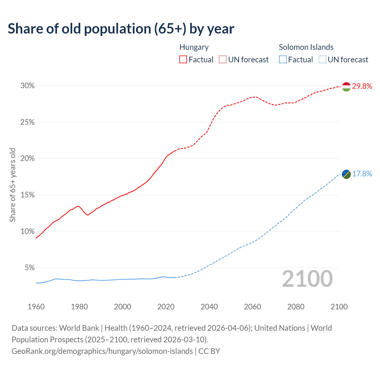 The share of older people aged 65 and over is 21% in Hungary and 3.64% in the Solomon Islands. Life expectancy in Hungary compared to the Solomon Islands .