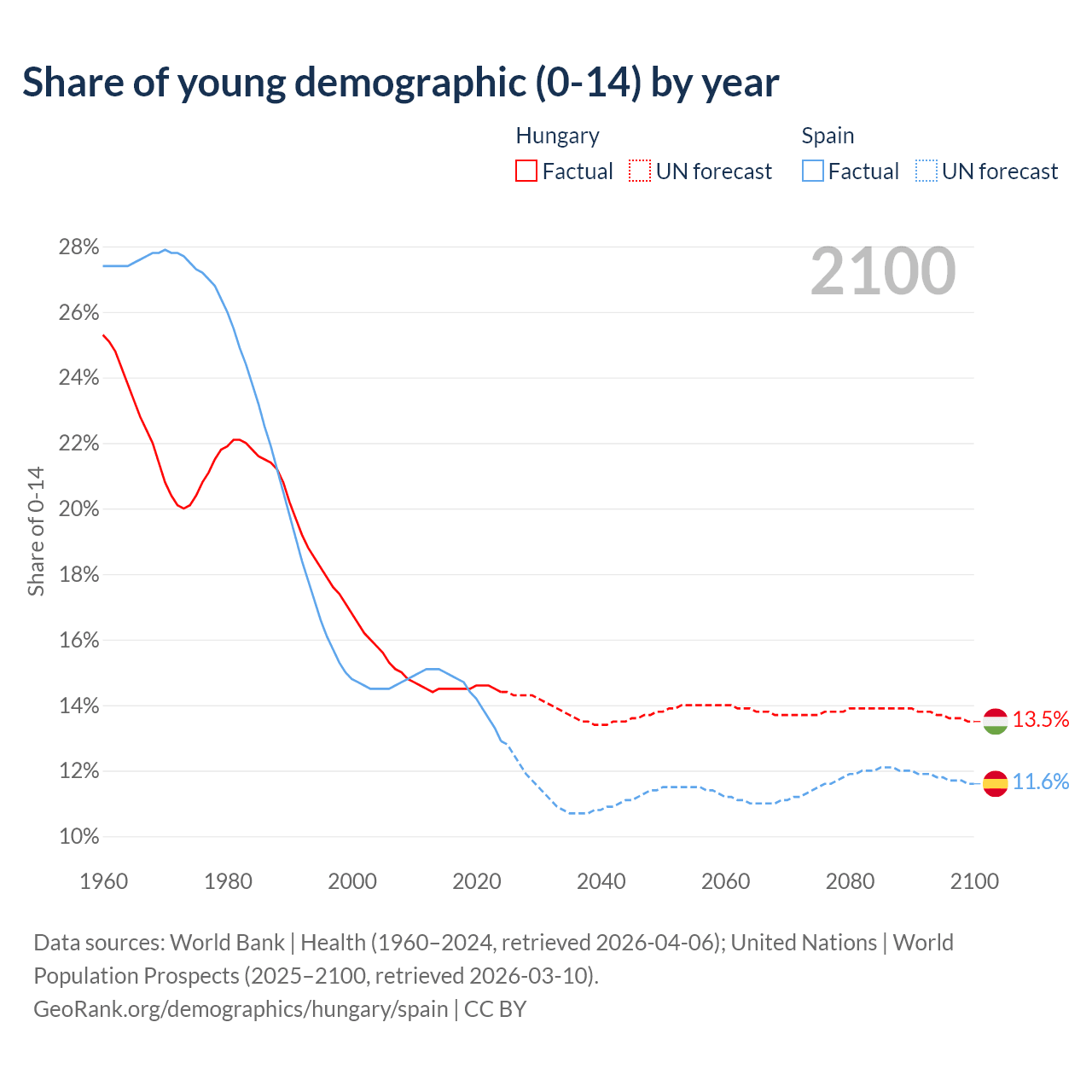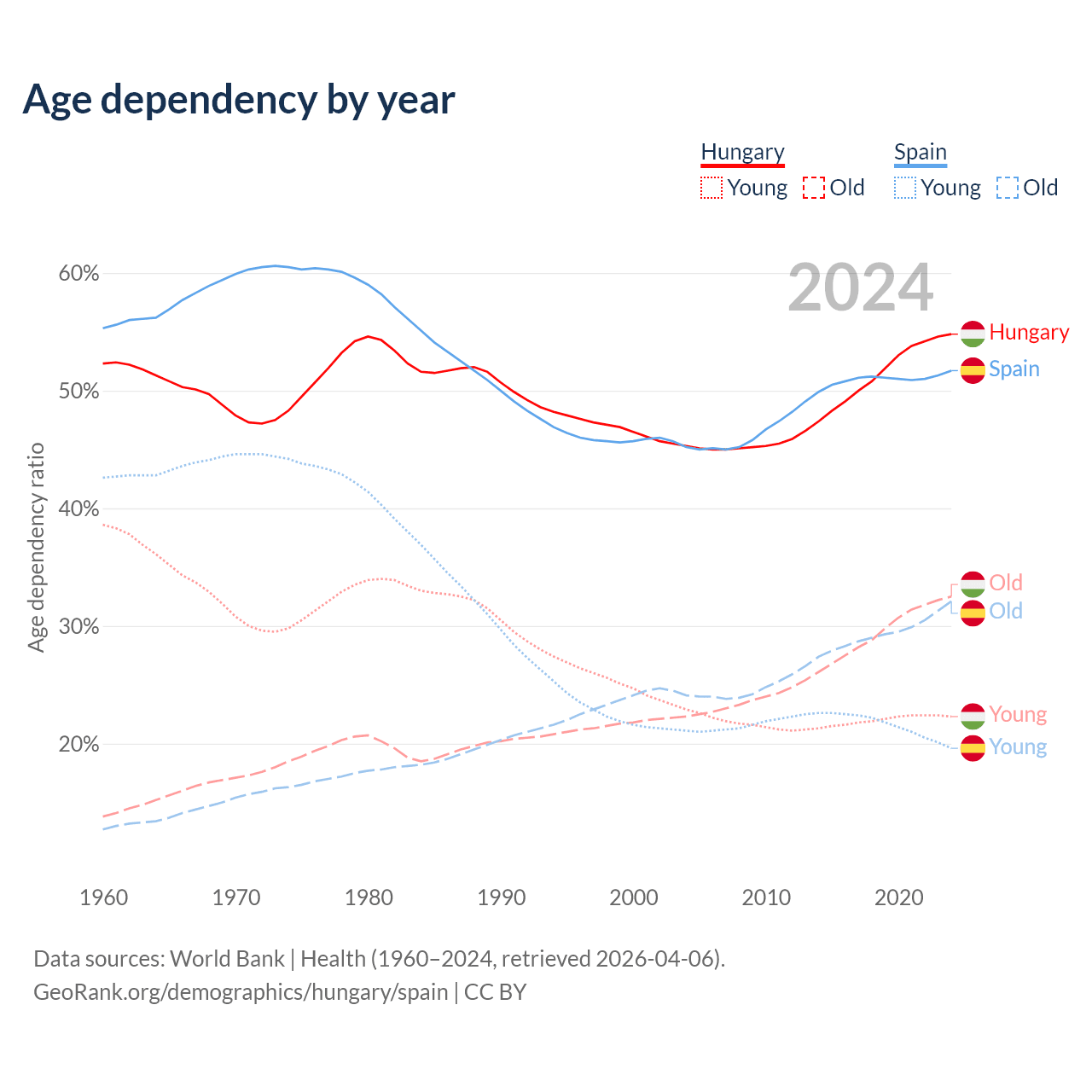 - Hungary is ranked 17/196 by median age (oldest to youngest) vs 7/196 for Spain.