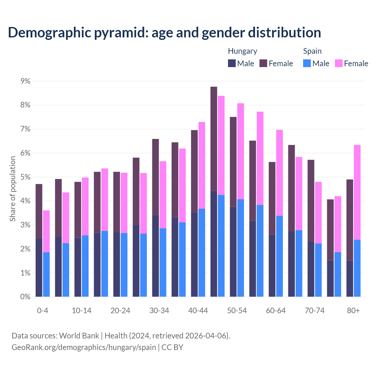 - The median age in Hungary is 44.6 years compared to 46.4 years in Spain.