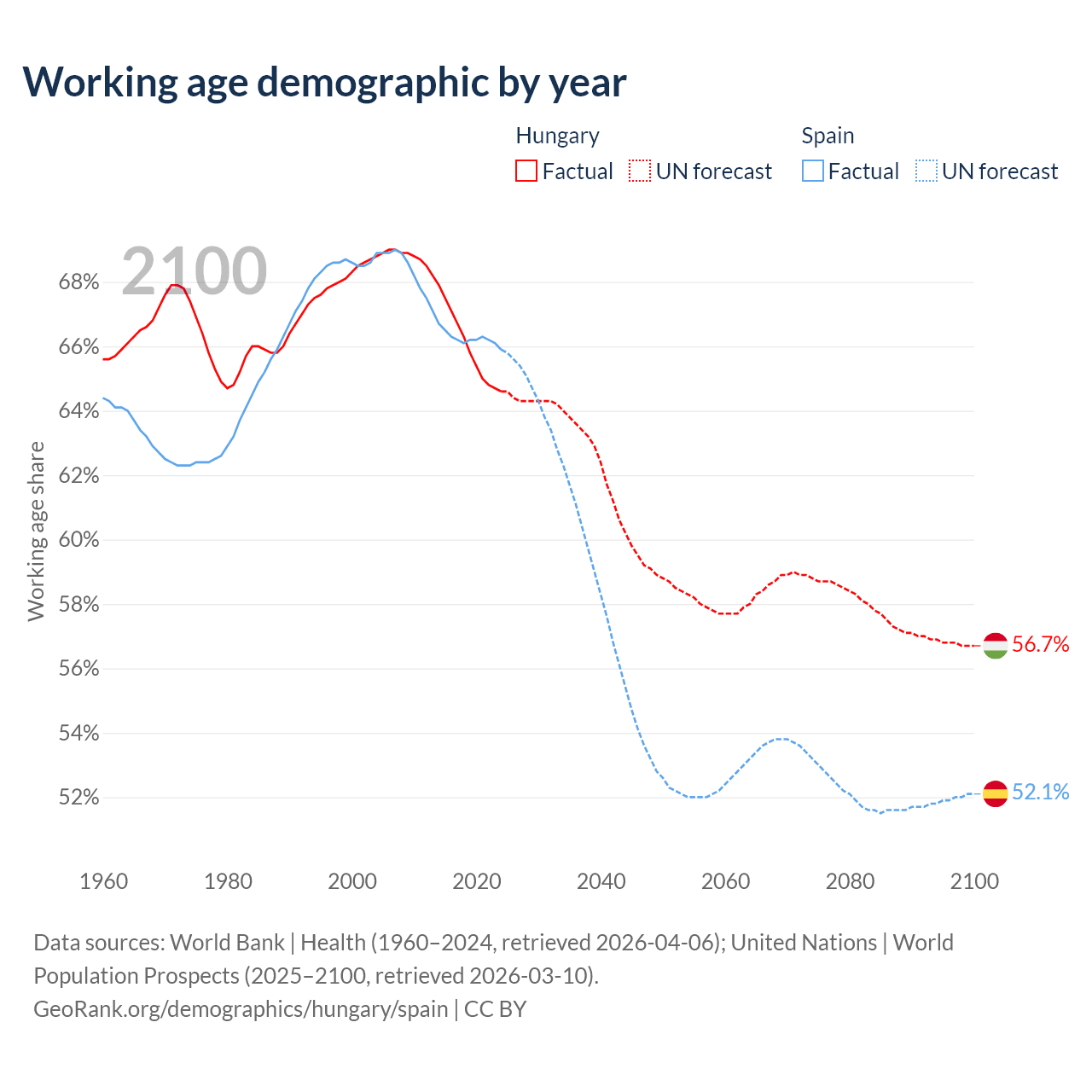 - Hungary has 6.12M working age adults (aged 15-64) vs 32.2M in Spain.