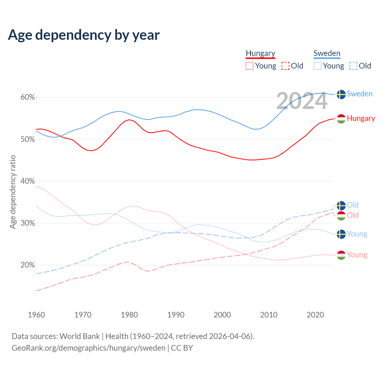 - Hungary is ranked 17/196 by median age (oldest to youngest) vs 39/196 for Sweden.