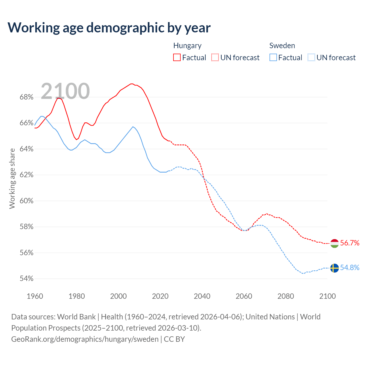 - Hungary has 6.12M working age adults (aged 15-64) vs 6.65M in Sweden.