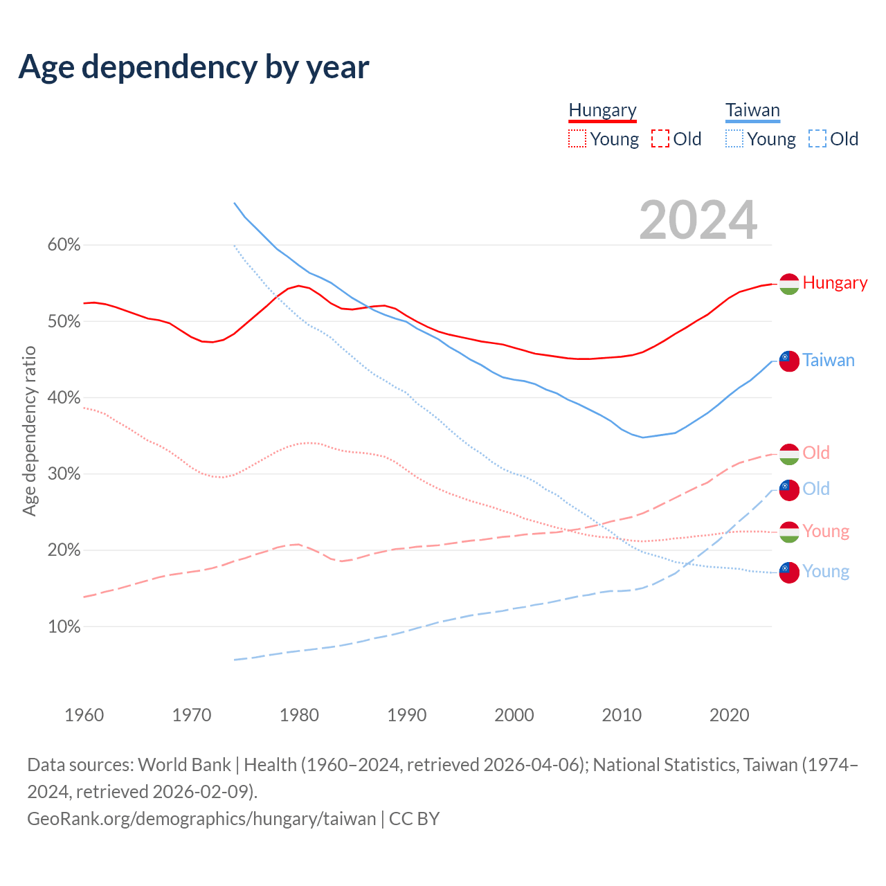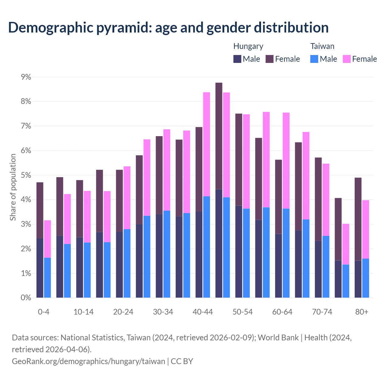- Hungary is ranked 17/196 by median age (oldest to youngest) vs 16/196 for Taiwan.