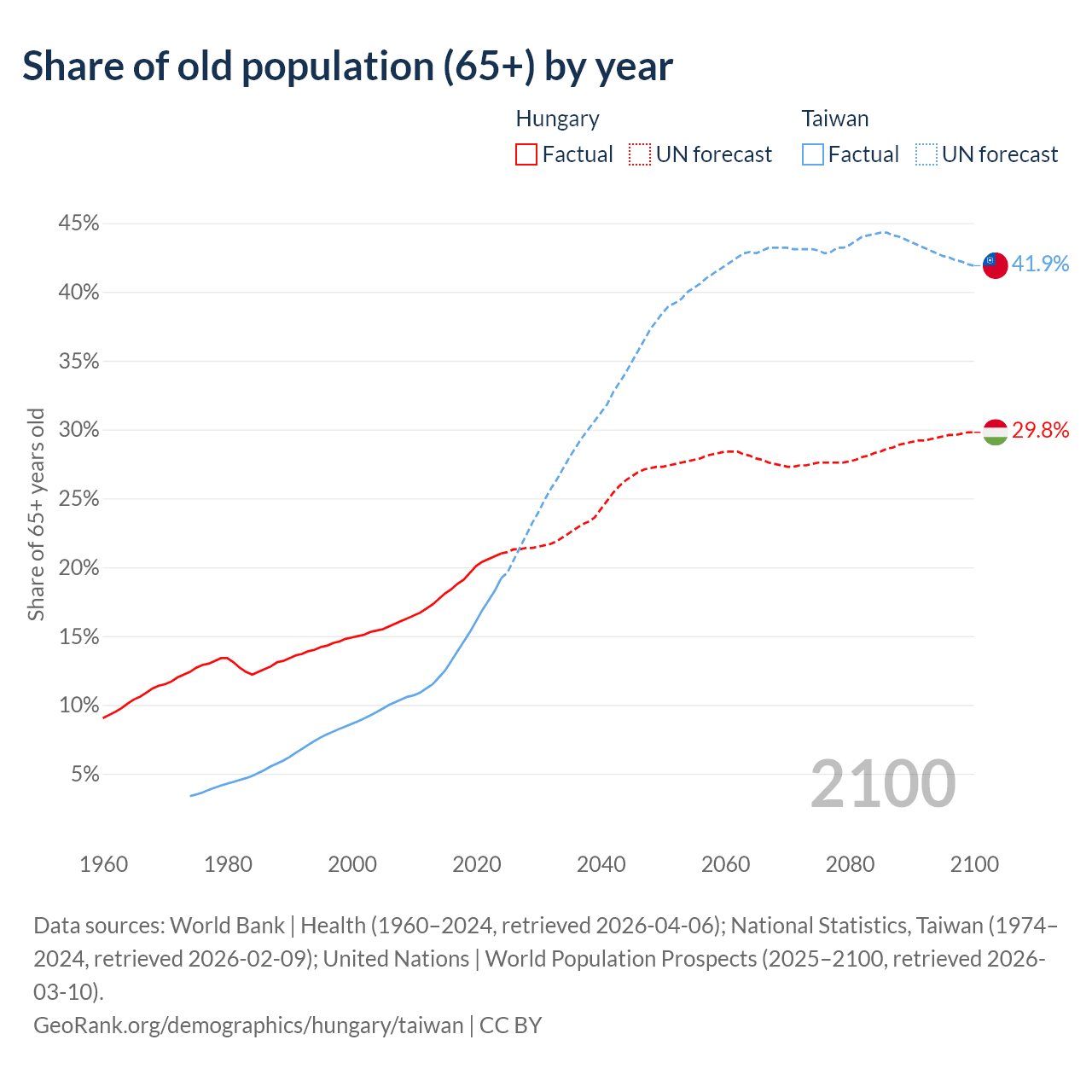 The share of older people aged 65 and over is 21% in Hungary and 19.2% in Taiwan. Life expectancy in Hungary compared to Taiwan .
