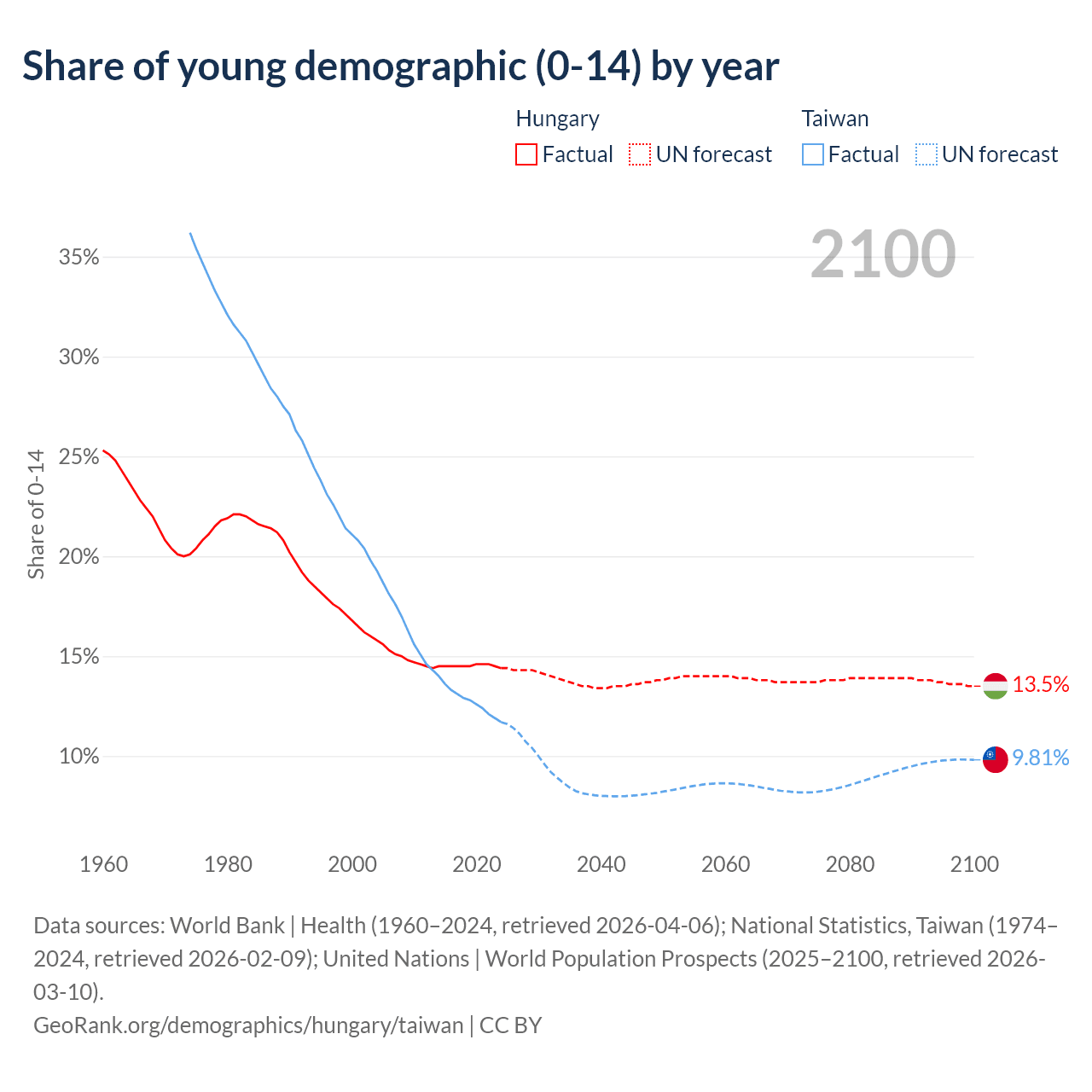 - The share of young demographic (0-15 years old) in Hungary is 14.4% vs 11.7% in Taiwan.