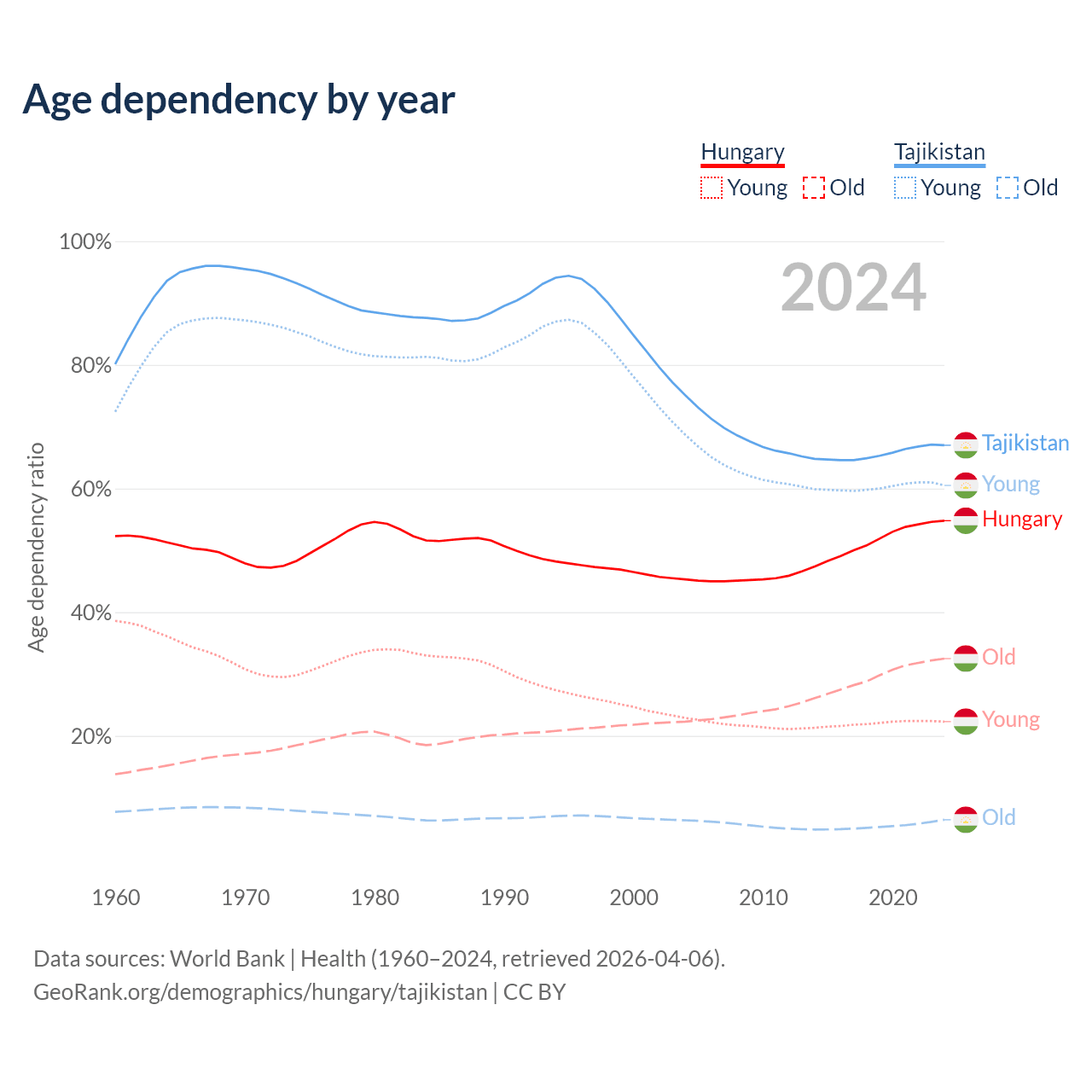 - Hungary is ranked 17/196 by median age (oldest to youngest) vs 142/196 for Tajikistan.