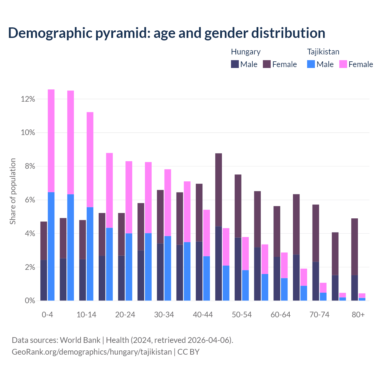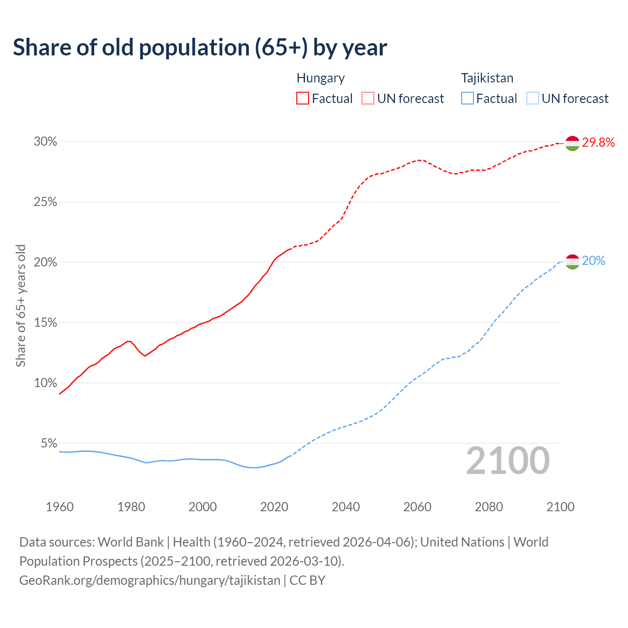 The share of older people aged 65 and over is 21% in Hungary and 3.85% in Tajikistan. Life expectancy in Hungary compared to Tajikistan .
