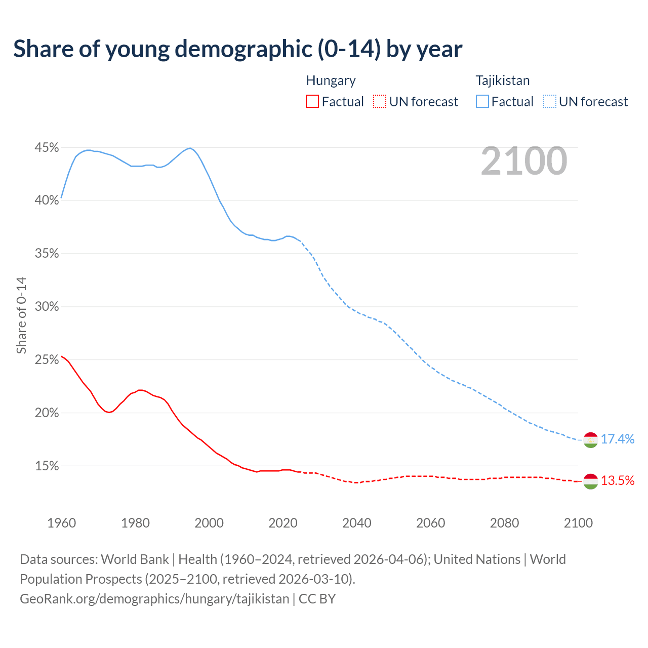 - The share of young demographic (0-15 years old) in Hungary is 14.4% vs 36.3% in Tajikistan.