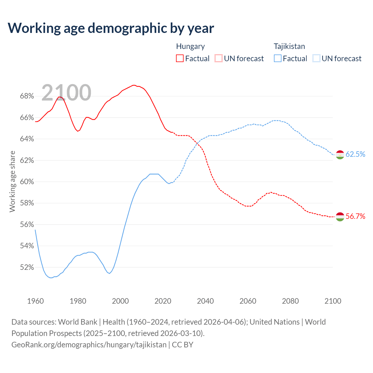 - Hungary has 6.12M working age adults (aged 15-64) vs 6.61M in Tajikistan.