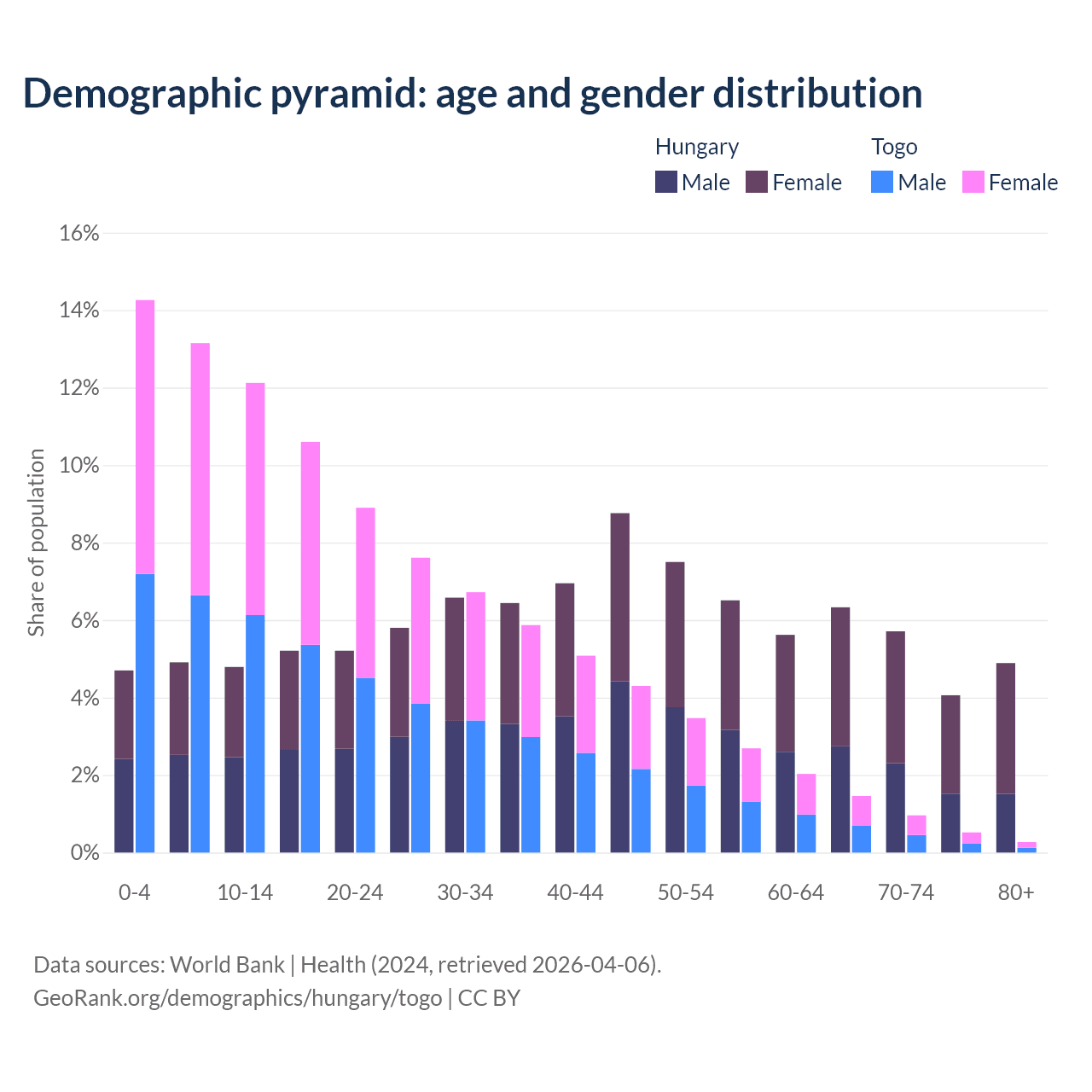 The share of older people aged 65 and over is 21% in Hungary and 3.21% in Togo. Life expectancy in Hungary compared to Togo .