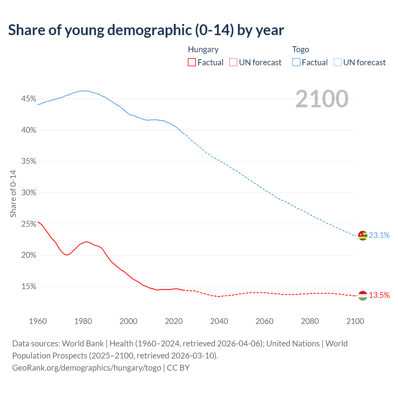 - The share of young demographic (0-15 years old) in Hungary is 14.4% vs 39.5% in Togo.