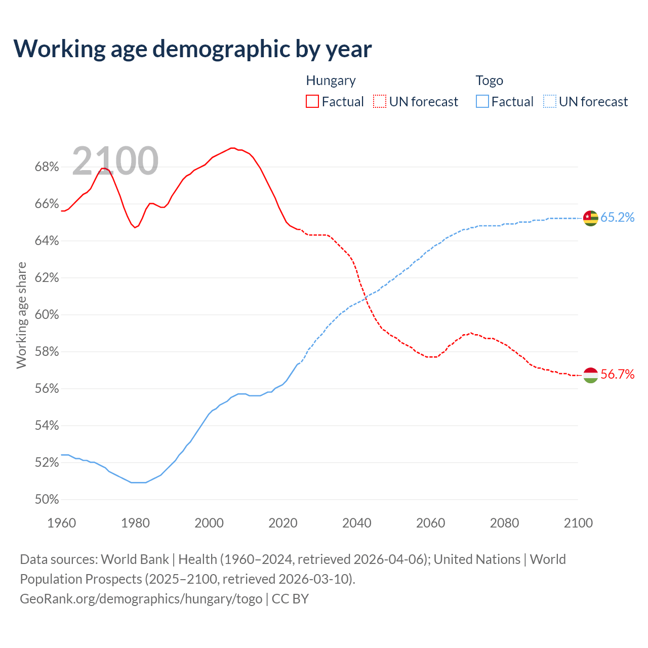 - Hungary has 6.12M working age adults (aged 15-64) vs 5.72M in Togo.