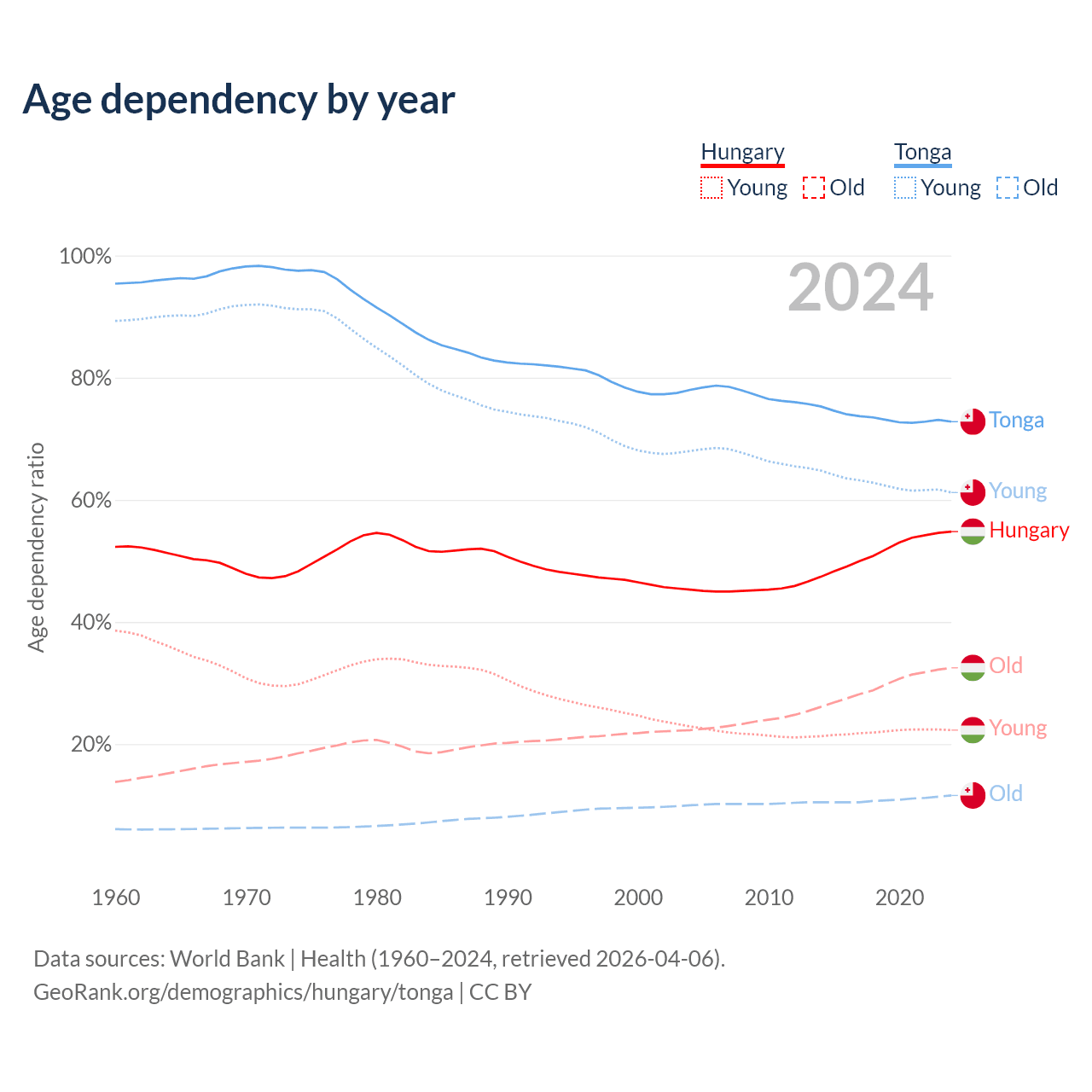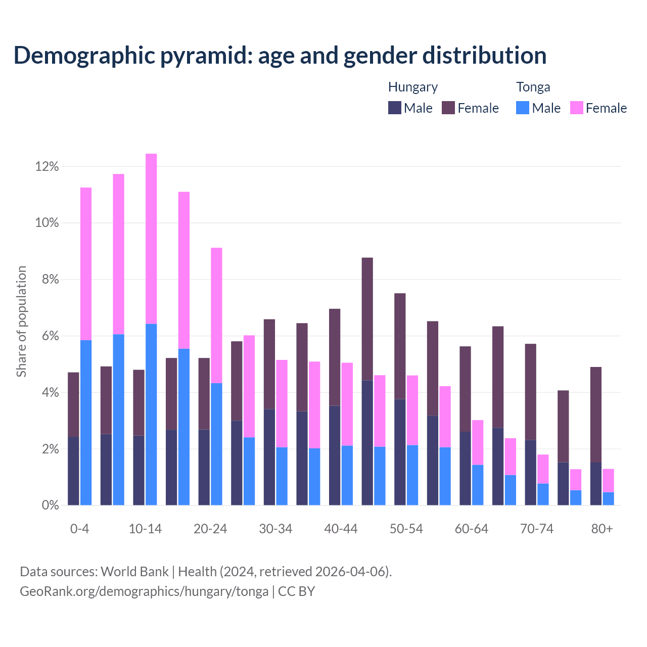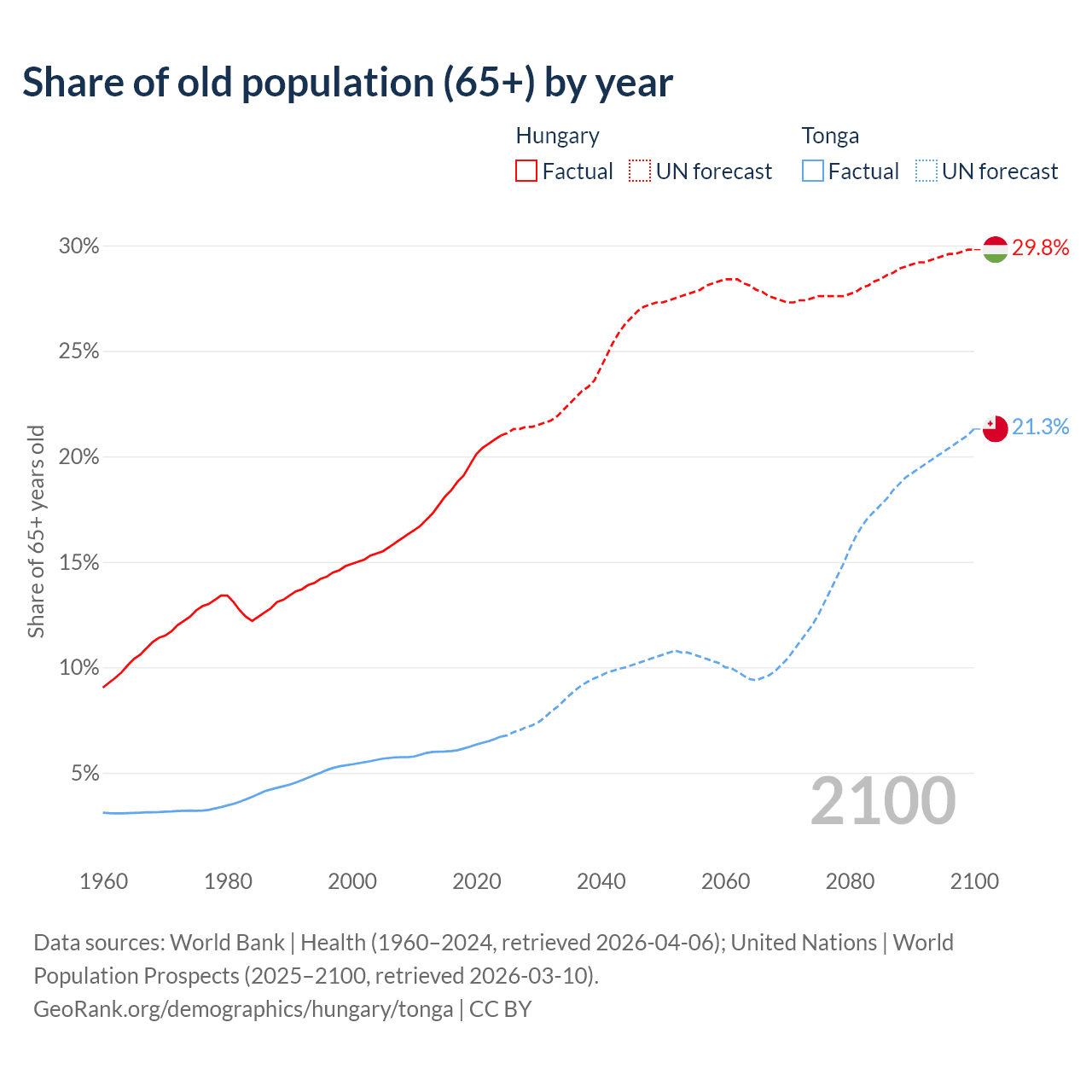 The share of older people aged 65 and over is 21% in Hungary and 6.72% in Tonga. Life expectancy in Hungary compared to Tonga .