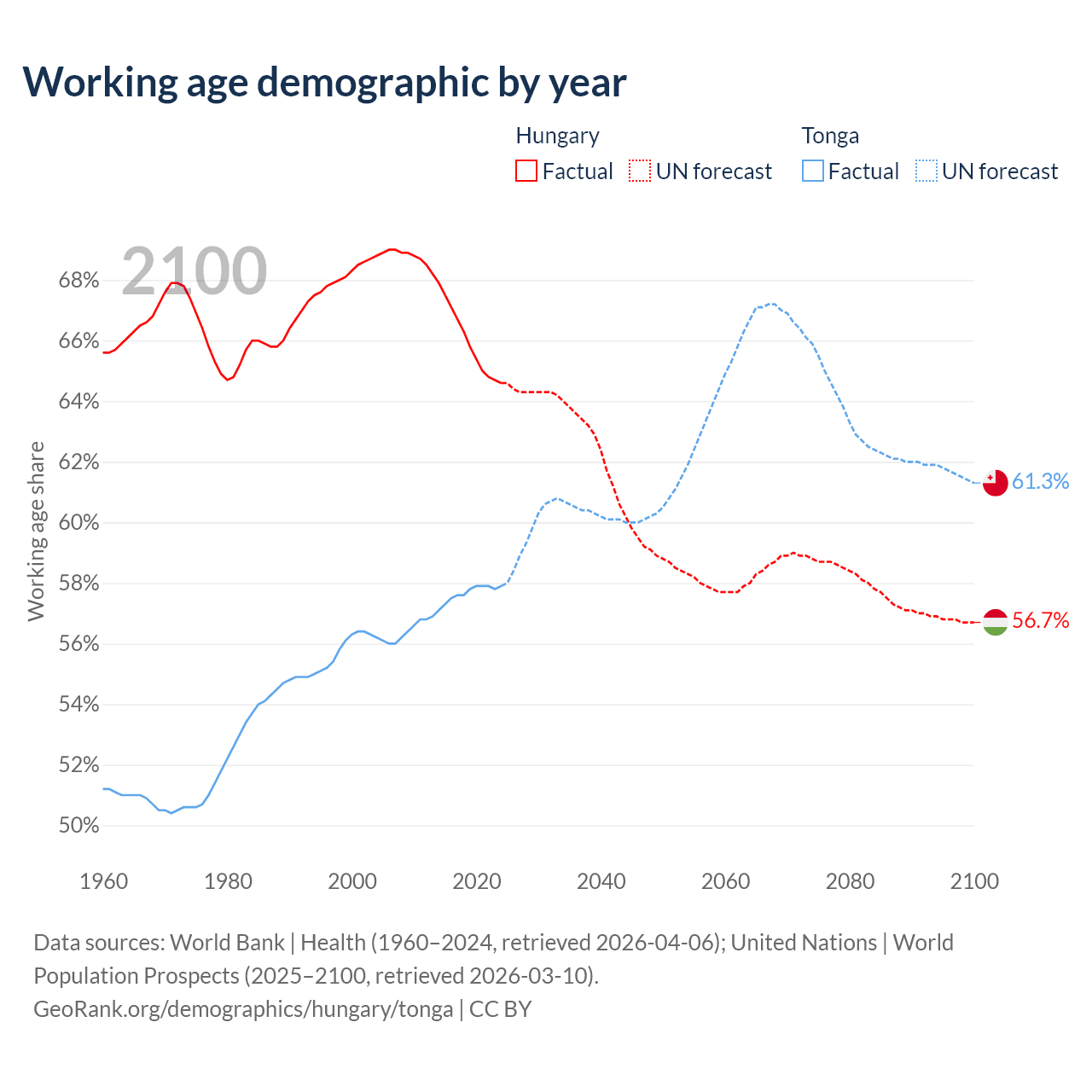 - Hungary has 6.12M working age adults (aged 15-64) vs 59.8K in Tonga.