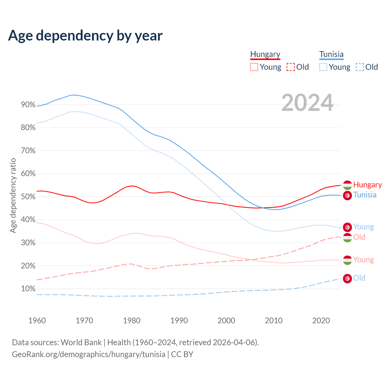 - Hungary is ranked 17/196 by median age (oldest to youngest) vs 86/196 for Tunisia.