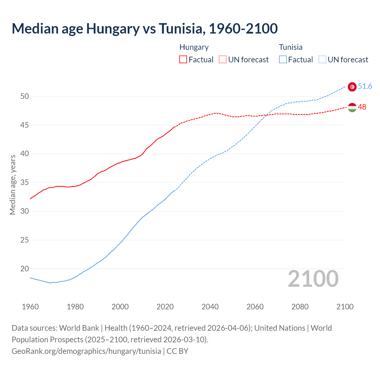 Median age Hungary vs Tunisia, 1960-2100