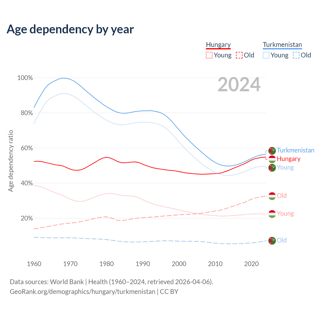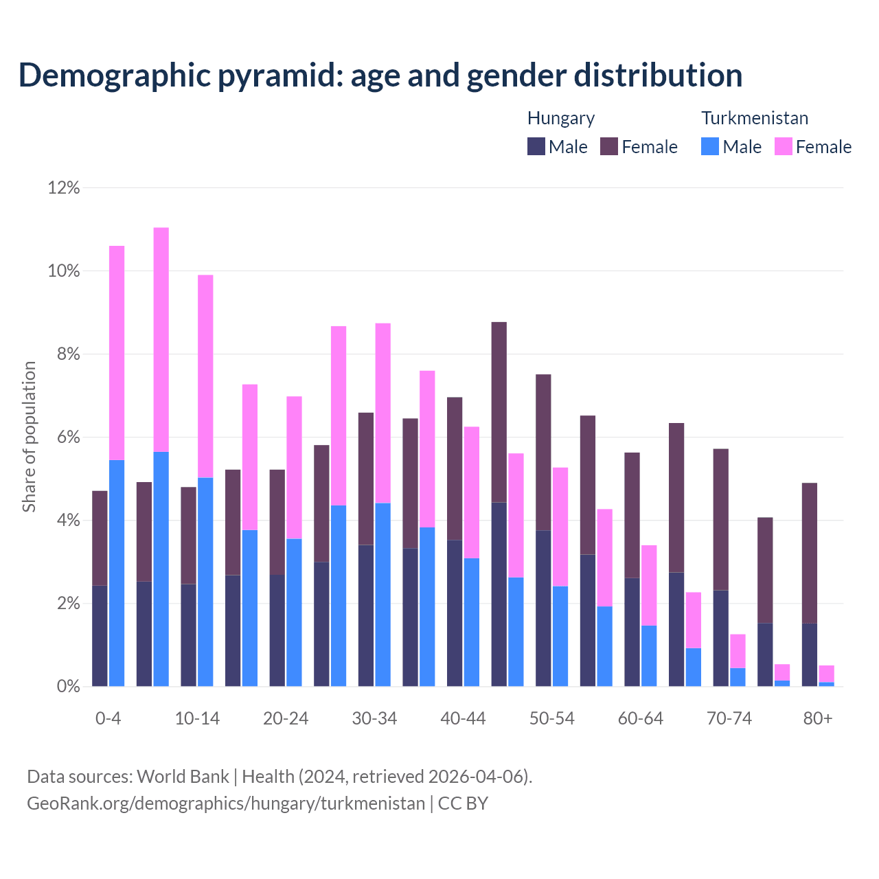 - Hungary is ranked 17/196 by median age (oldest to youngest) vs 119/196 for Turkmenistan.