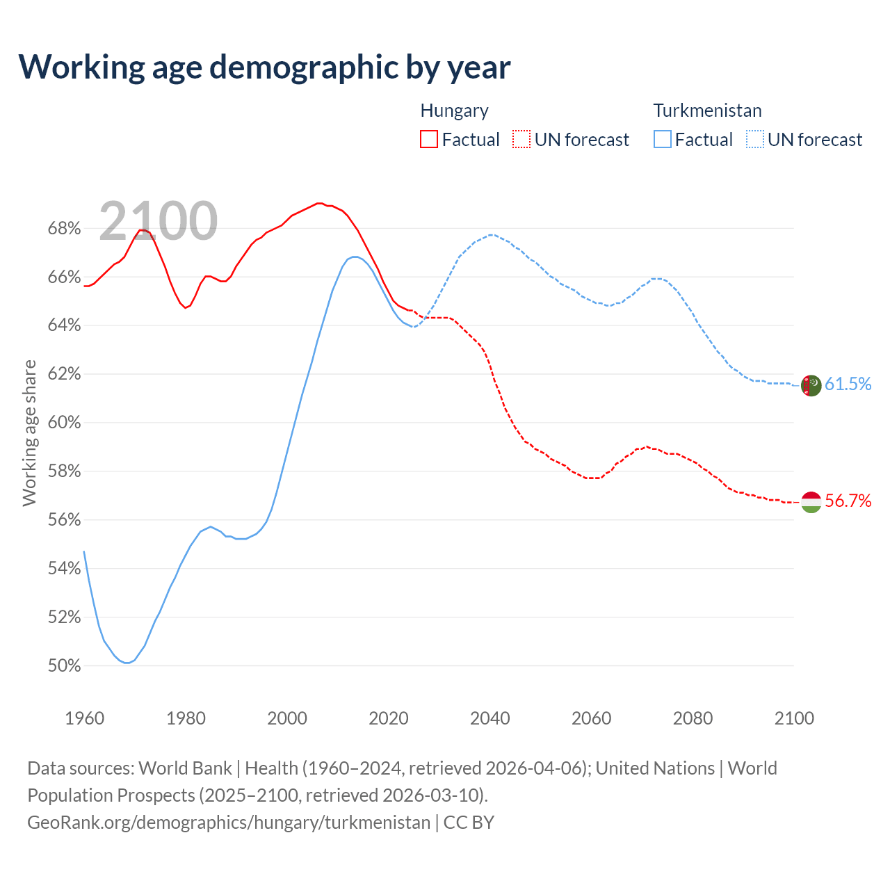 - Hungary has 6.12M working age adults (aged 15-64) vs 4.97M in Turkmenistan.