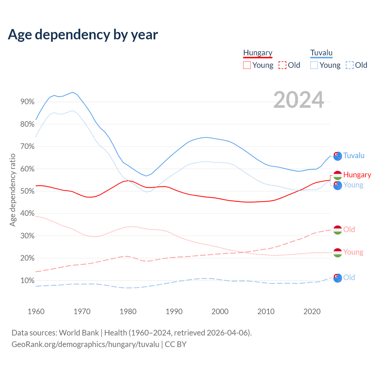 - Hungary is ranked 17/196 by median age (oldest to youngest) vs 132/196 for Tuvalu.