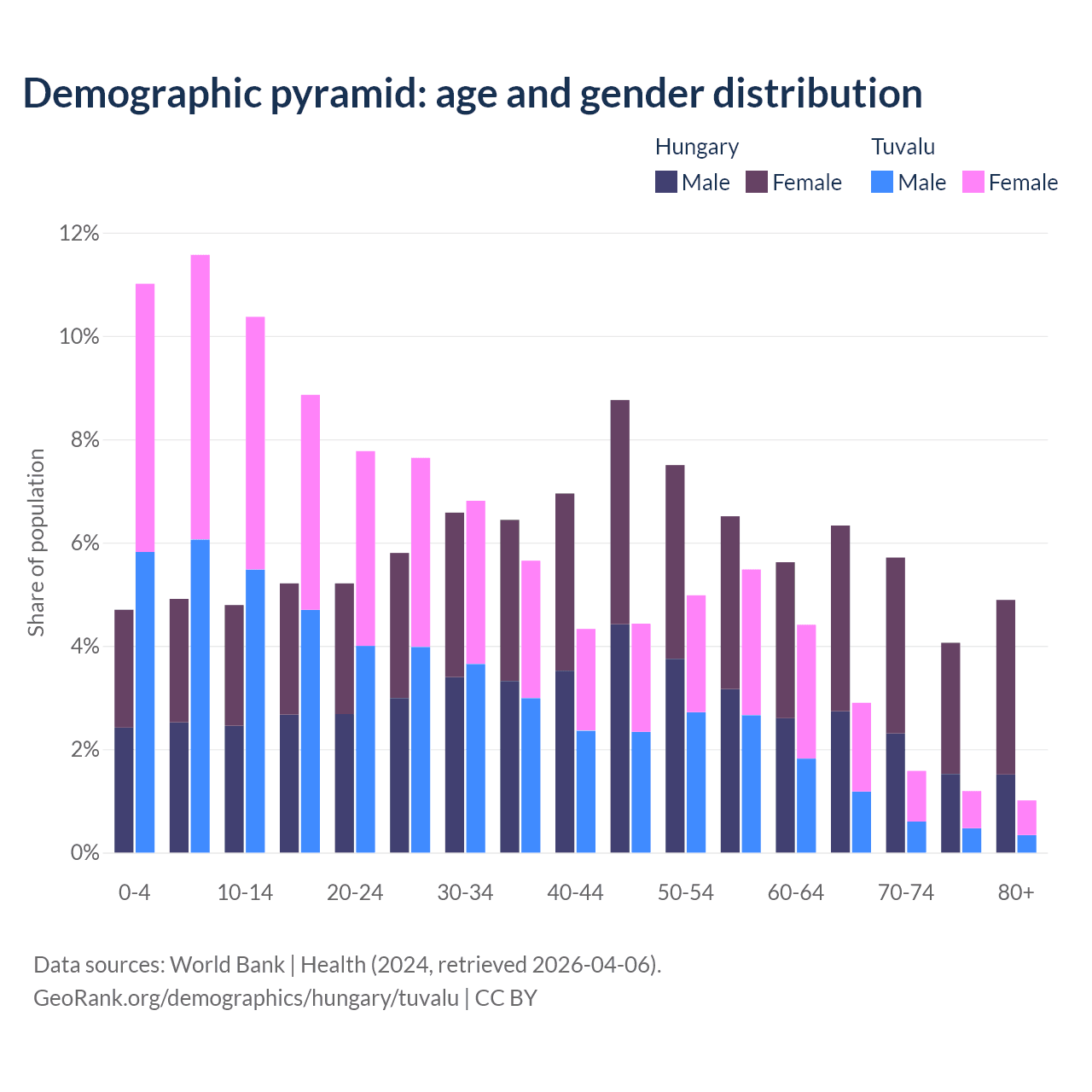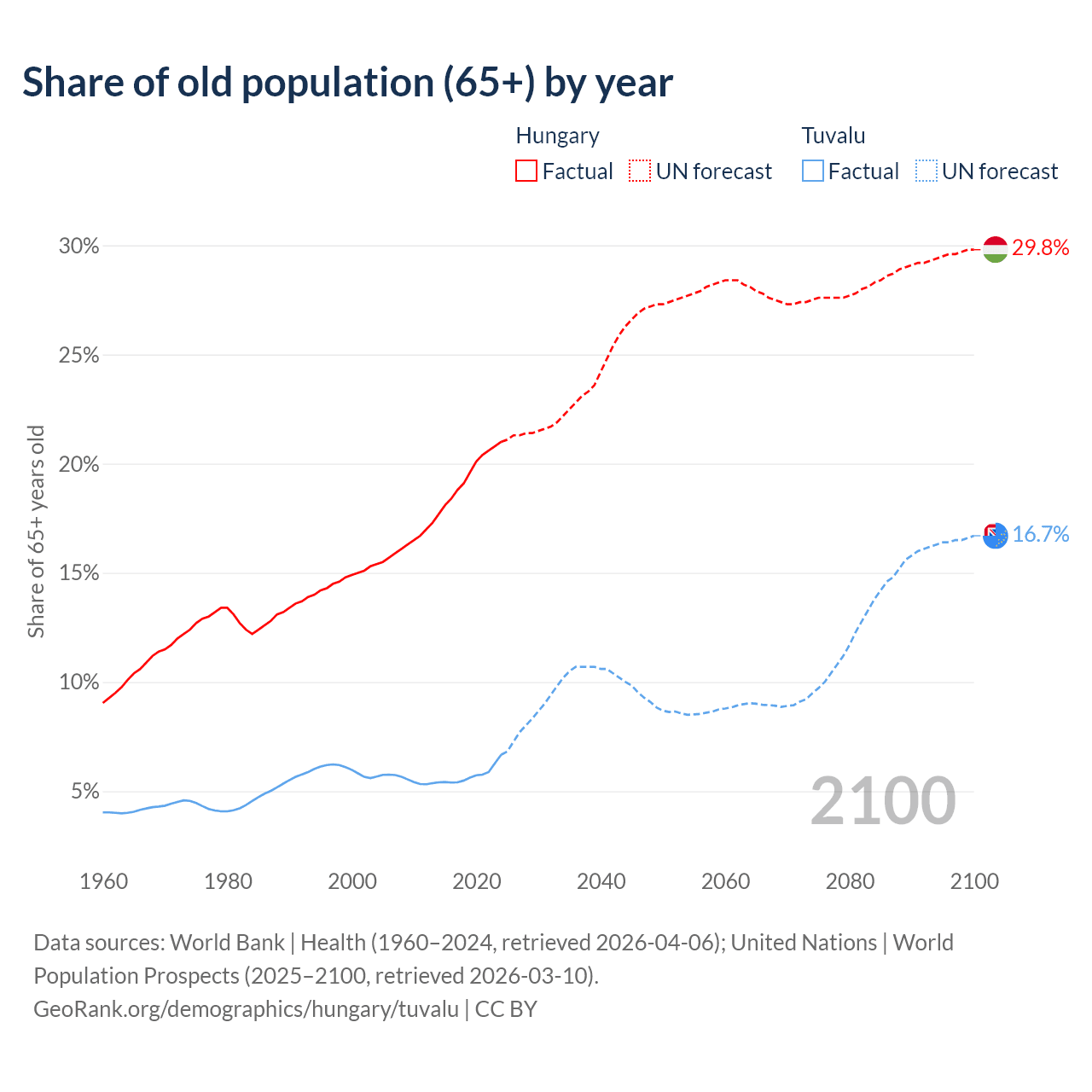 The share of older people aged 65 and over is 21% in Hungary and 6.67% in Tuvalu. Life expectancy in Hungary compared to Tuvalu .
