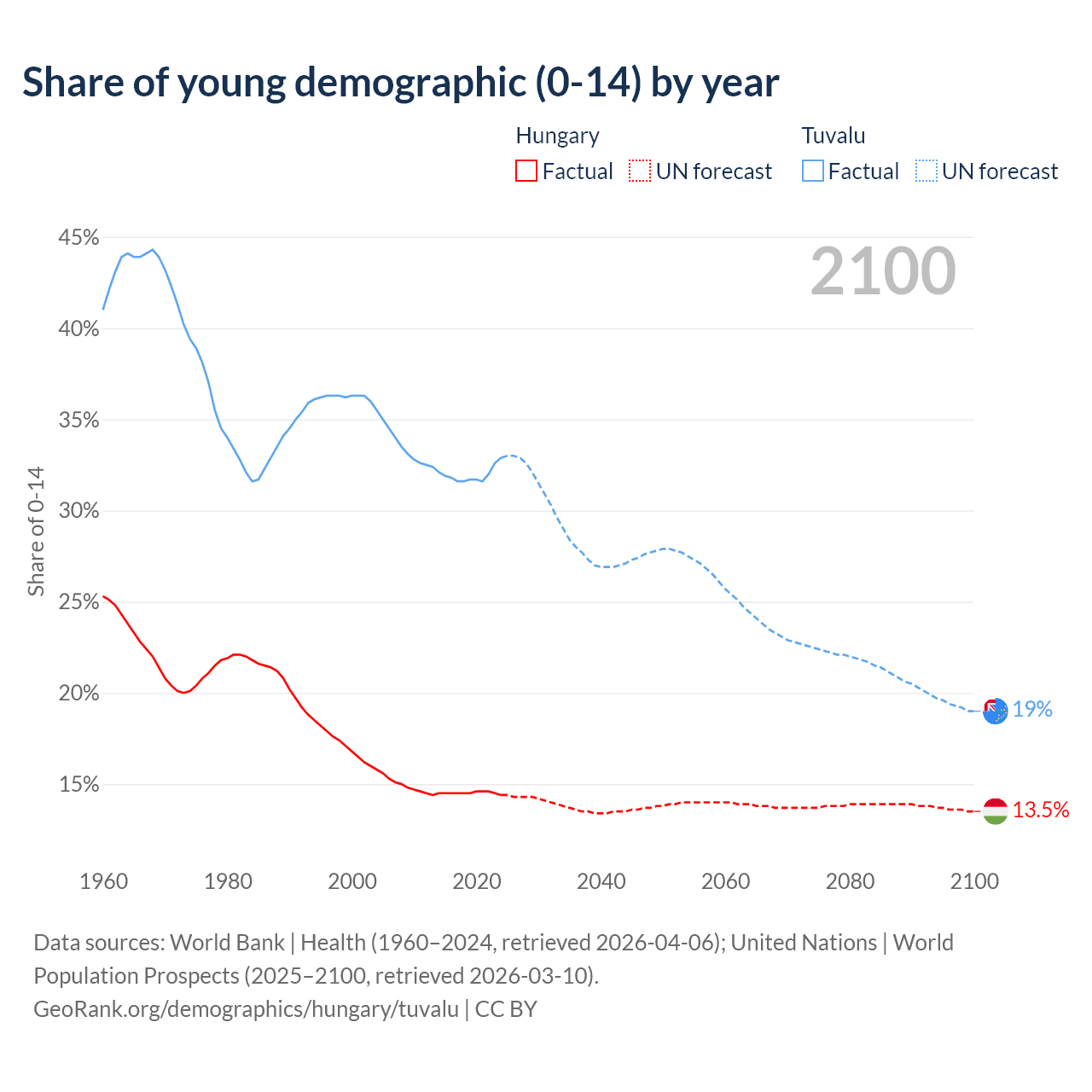 - The share of young demographic (0-15 years old) in Hungary is 14.4% vs 32.9% in Tuvalu.