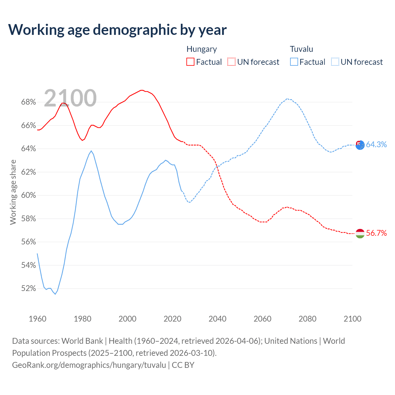 - Hungary has 6.12M working age adults (aged 15-64) vs 5.64K in Tuvalu.