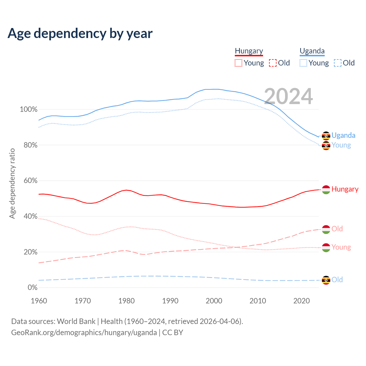 - Hungary is ranked 17/196 by median age (oldest to youngest) vs 187/196 for Uganda.